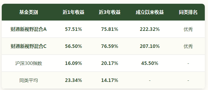 说到具体数据,咱们来看看这只基金的"成绩单"。财通新视野混合C类近一年的收益率达到了56.50%,在同类4543只基金中排第187名,这个表现可以说是相当亮眼了。更厉害的是,近三年的收益率达到了76.59%,在4317只同类基金中排第57名。这说明什么?说明这只基金不仅短期表现好,长期稳定性也不错。