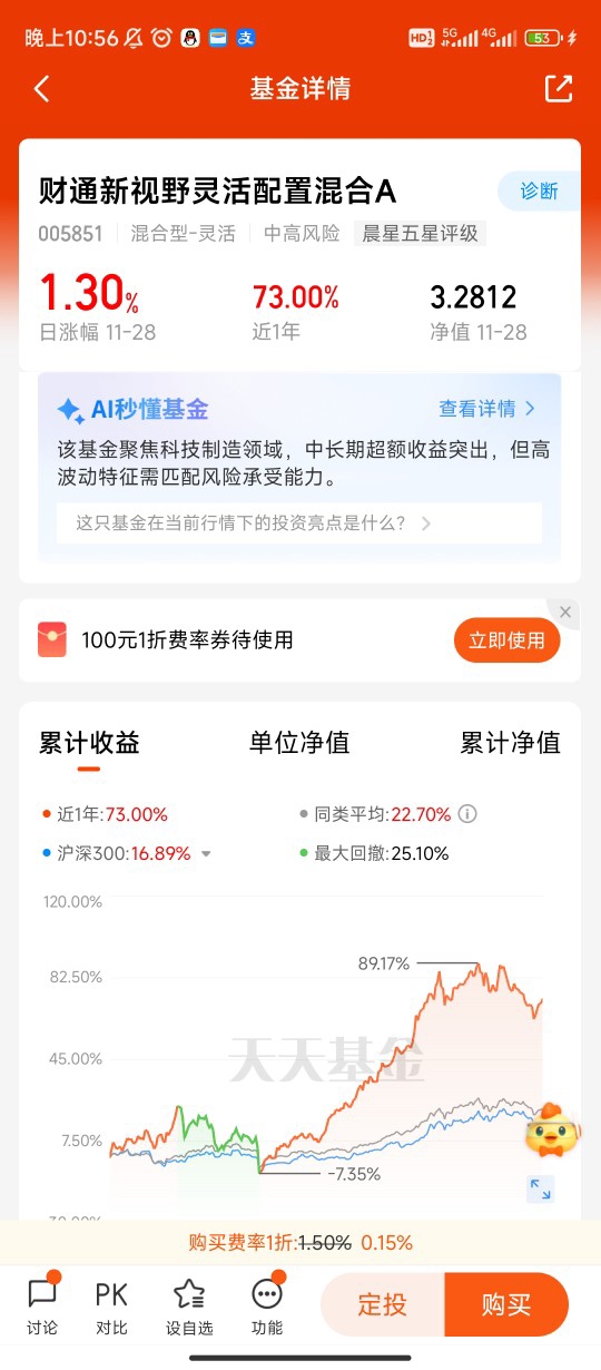 在财通新视野混合A(基金代码:005851)的投资策略中,风险与收益并非简单的对立关系,而是一种动态平衡的艺术。截至2025年11月的最新数据,该基金近一年年化收益率达73.0%,近三年年化收益率21.82%,展现出了卓越的收益能力。