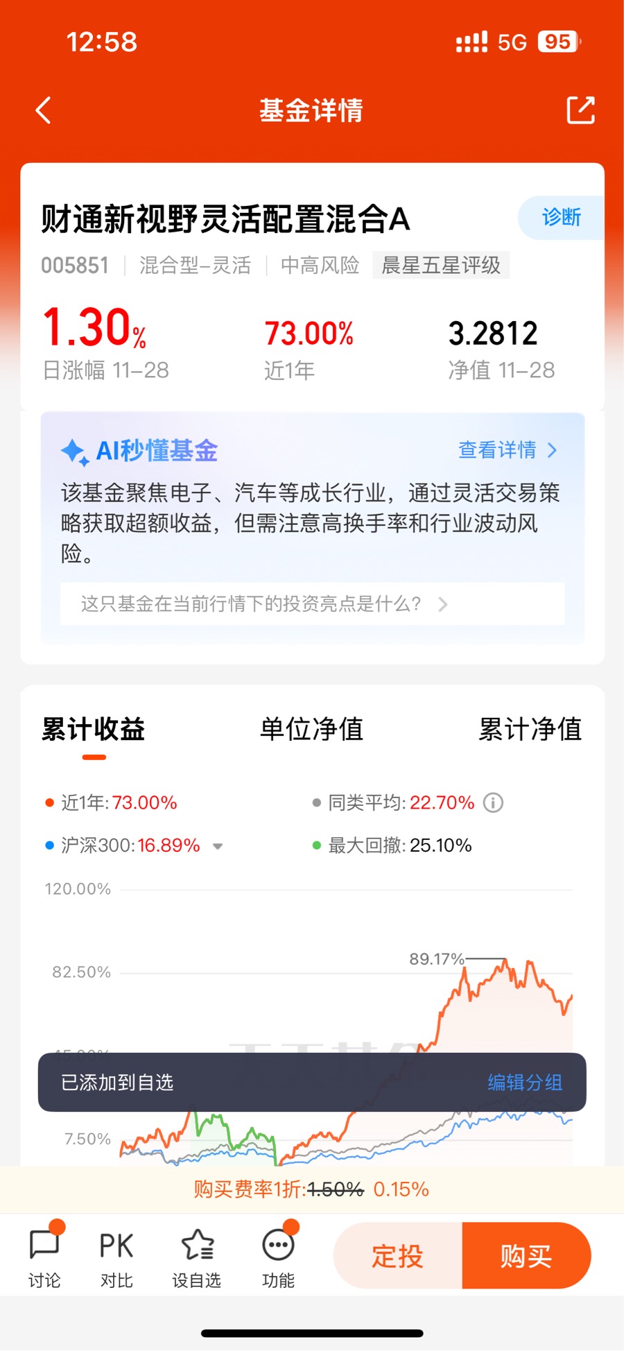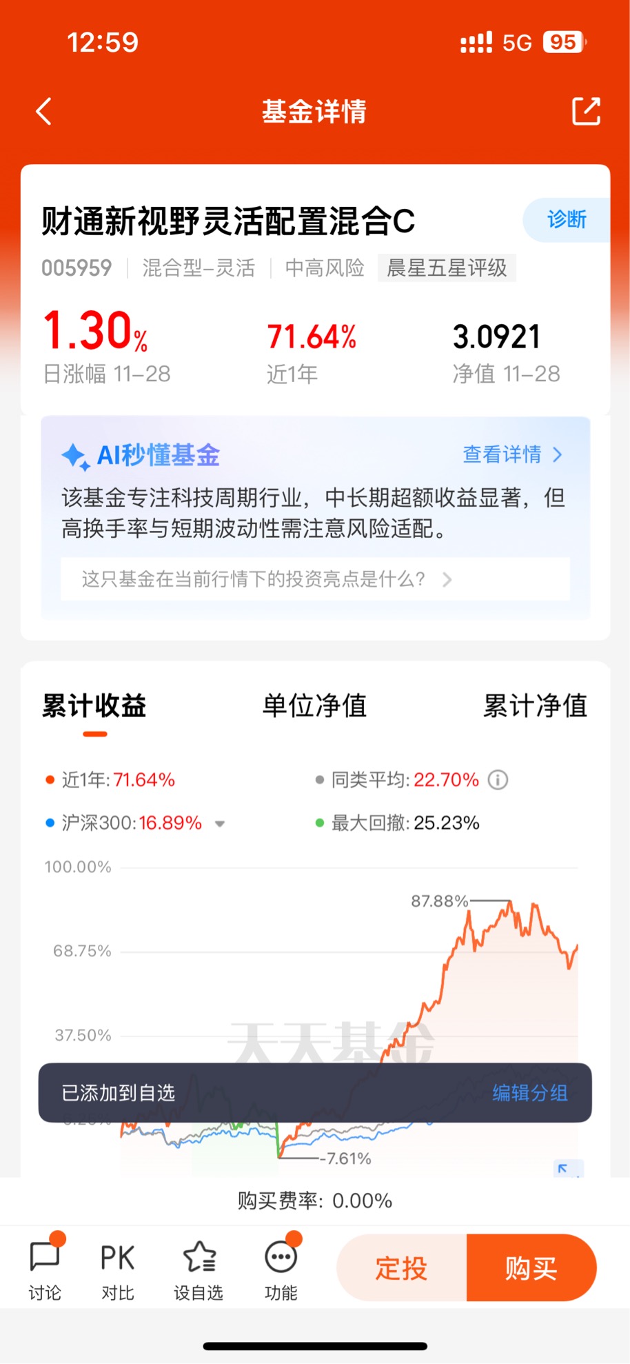这只基金给我的第一重平衡,来自行业与标的的分散布局。过去我偏爱单赛道押注,曾因重仓新能源基金在板块调整时遭遇20%以上的回撤,而财通新视野混合A从不会把鸡蛋放在一个篮子里。它的持仓既覆盖了消费、医药这类刚需防御板块,又会适时布局科技、制造等成长赛道,单一行业占比始终控制在30%以内。2024年四季度市场风格切换,消费板块回暖而科技回调,正是这种分散配置让基金净值仅出现5%的小幅波动,远低于我此前持有的行业主题基金。