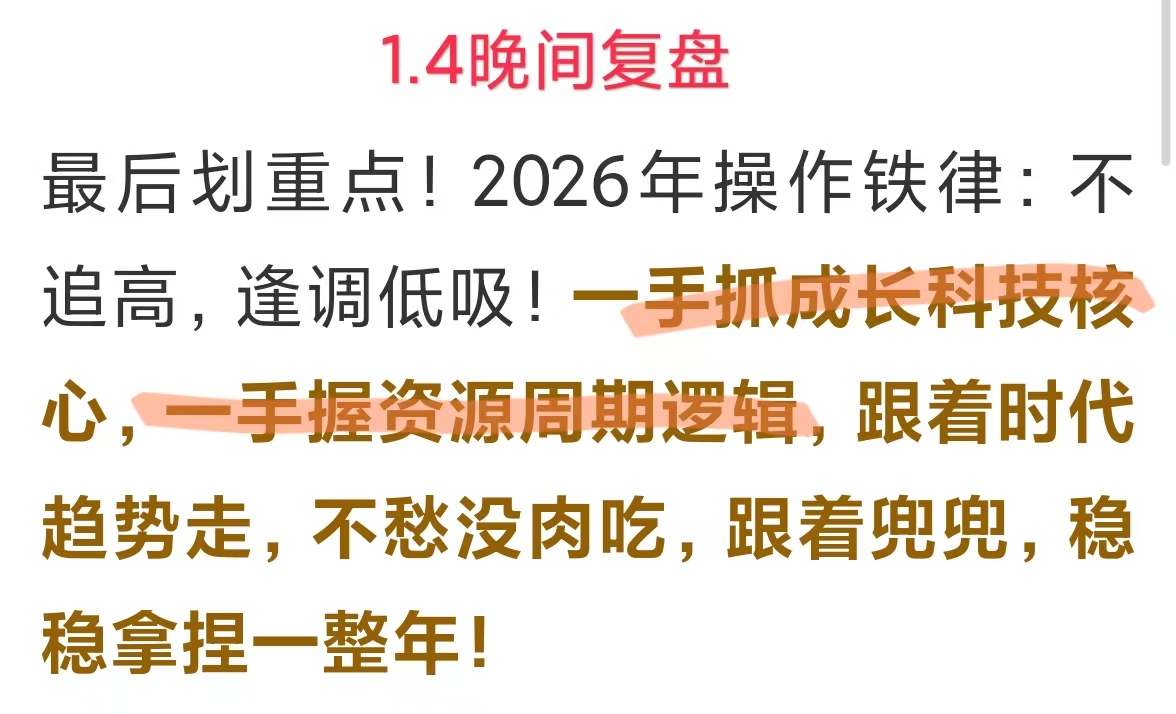 另外三大重磅消息要重视:宇树机器人、优必选机器人确定参演春晚,周五资金已经提前抢跑,基金明天大概率继续收红;老美要求存储芯片厂商赴美建厂,否则加征100%关税,叠加存储已进入超级周期,一季度预计涨价50%,周五美光科技大涨7%,周一存储芯片大概率高开;国家医保局下场支持医疗器械出海,创新药同步受益,低估值高景气方向,兜兜持续看好!
