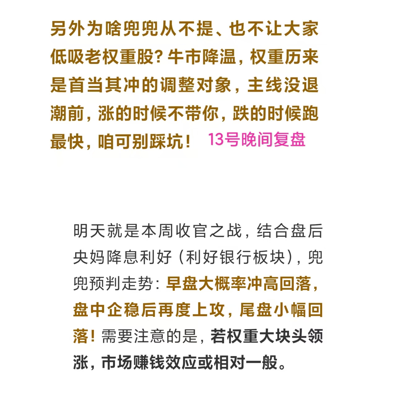 兜兜周四晚间精准预判大盘走势:大概率冲高回落、盘中企稳再上攻、尾盘小幅回落,实际走势完全复刻!当时就提醒大家,如果是权重大块头领涨,那市场赚钱效应就相对一般!这不科技赛道发力一片红红火火,反而三大指数收跌,核心就是无形大手精准砸盘权重大块头,银行、保险、传统消费这类老权重,涨时不跟涨、跌时先冲锋,又成了牺牲品!咱也就有了赚钱效应。这正是兜兜14号复盘反复提示,不让大家低吸老权重的原因,再次完美验证!牛市降温,权重历来是调整首当其冲的品种,主线没退潮前,千万别踩这个坑!