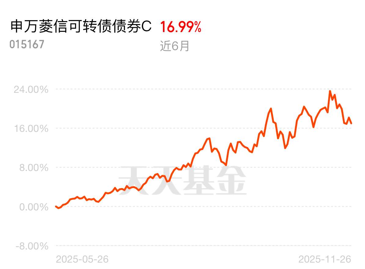 纯固收产品在债市震荡、权益上行的市场里难以发力,固收+产品成了最优解,申万菱信可转债债券C近6个月收益16.99%,固收打底稳扎稳打,权益部分配置有色、电子大热赛道,后续上升趋势清晰,赶紧上车不踏空。