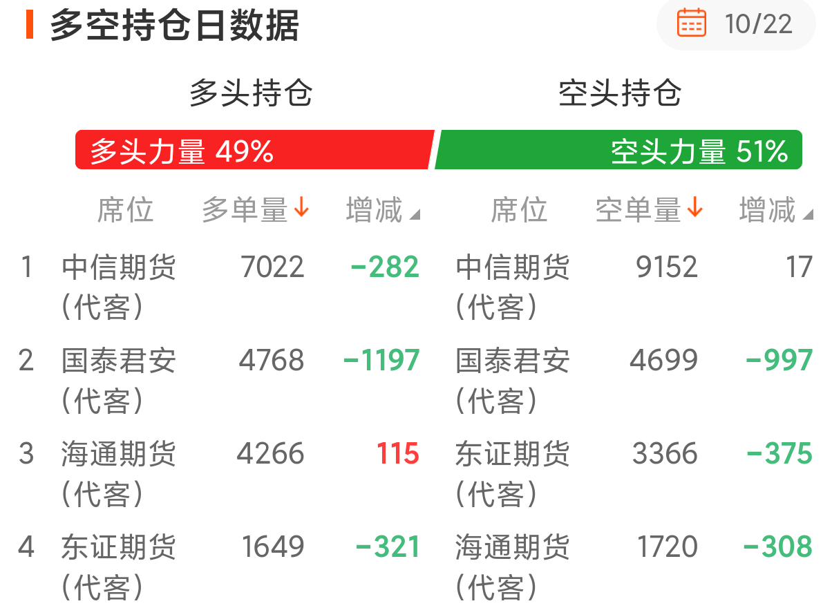 从11月期的沪深300期指数据来看,中信席位的多头减持多单282手,空头增持空单17手,空头势力依旧稍强,短期有压力。