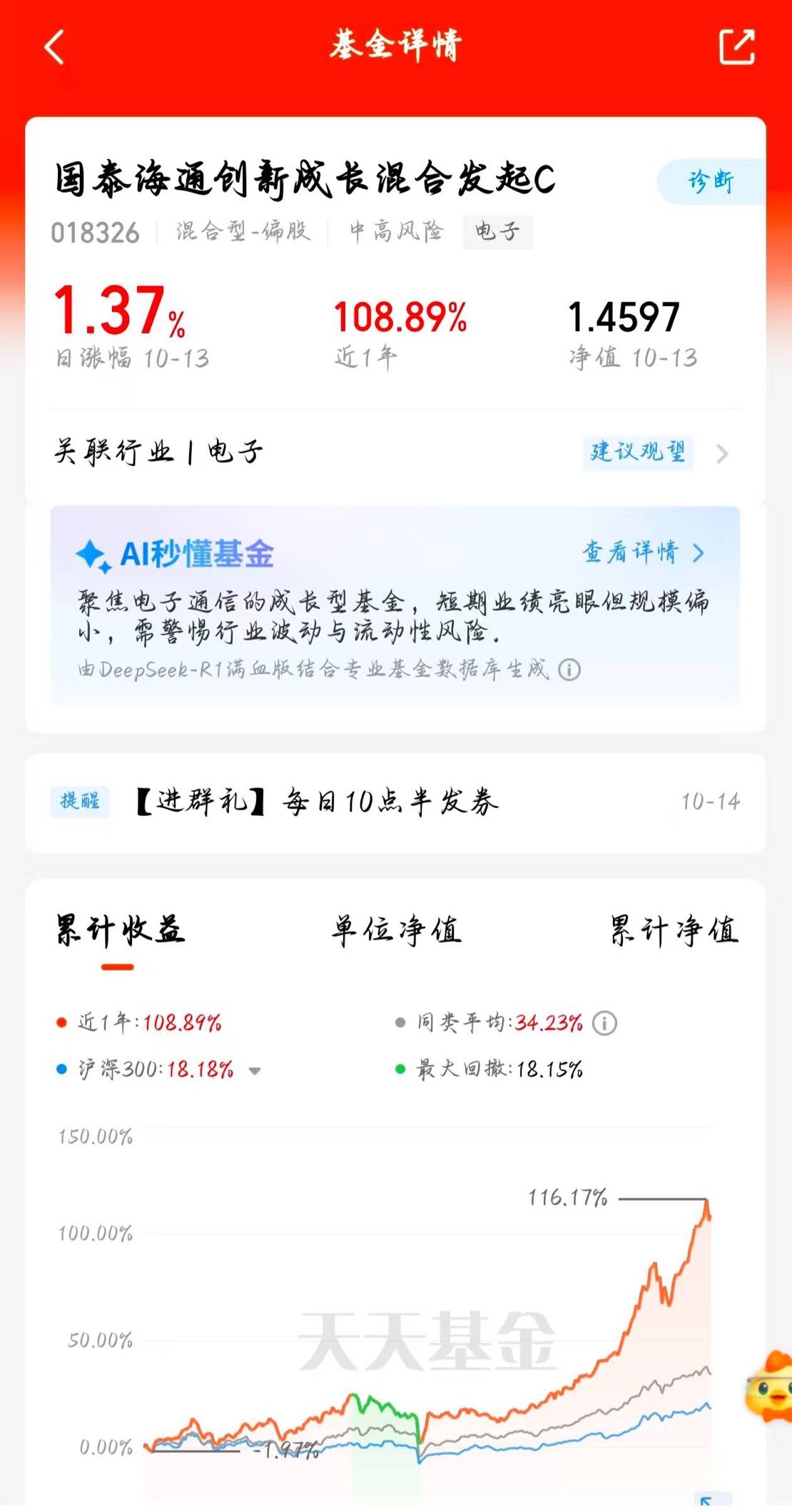算力基昨天表现太棒了,单日涨1.3%多,今年收益108%回撤才18%,这样的基金
