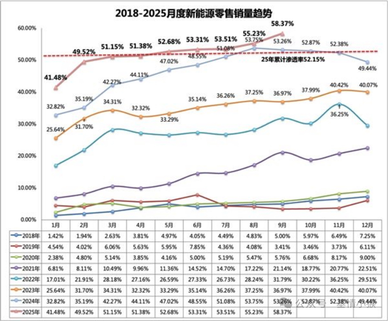 作为近年高景气产业,在新能源汽车渗透率一路向上的成长历程中,蕴含着丰富的产业信号。工信部数据显示,从2018年1月仅1.42%的渗透率起步,中国新能源汽车市场用七年时间完成了从萌芽到主流的历史性跨越。特别是2024年7月渗透率首次突破50%大关后,行业进入加速攀升期,2025年1-9月累计渗透率已达52.15%,9月单月更是直接冲刺至58.37%。
