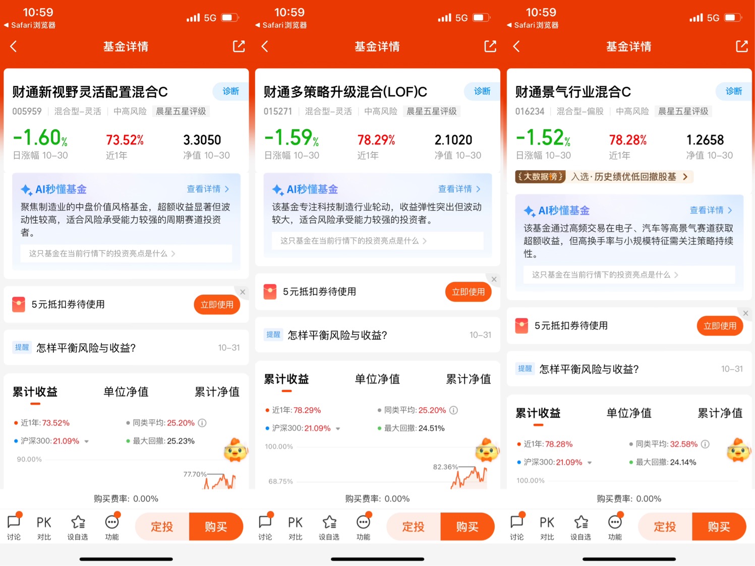 就说财通这几只基金吧,财通新视野灵活配置混合C、财通多策略升级混合(LOF)C、财通景气行业混合C,它们近一年收益都在70%以上,看着挺诱人,但我不会只看这个数字。我会去扒它的持仓、基金经理的风格、行业的周期。比如财通新视野,它聚焦制造业的中盘价值风格,行业配置里电子占了36.72%、汽车10.9%,这些赛道是不错,但也得知道它的高换手率(年化144%)和中高持仓集中度(61.21%),这意味着它收益弹性大,但波动也不会小。所以我把它放进我的组合里时,就会考虑它的风险水平,不会把太多钱砸进去。