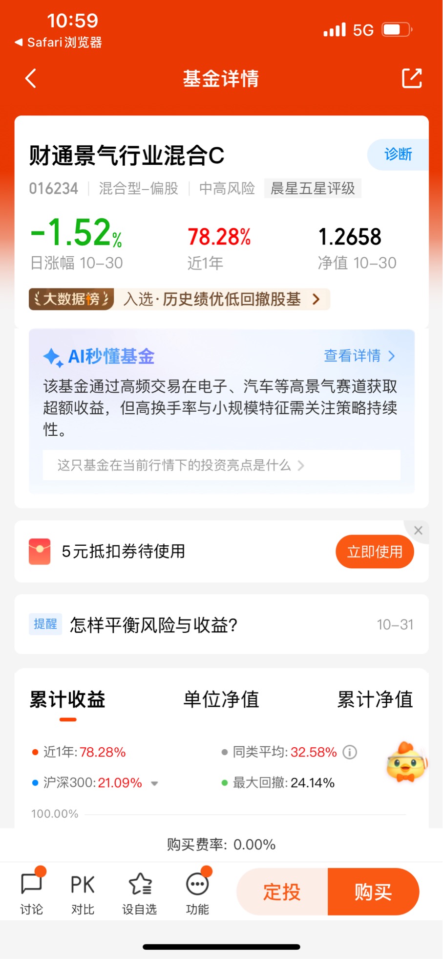 在组合里,每只基金的仓位也得有讲究。像财通景气行业混合C这种收益高但波动大的,我可能只给它分配20%的仓位;而一些比较稳健的基金,仓位可以高一些。这样就算某只高风险基金跌了,对整体组合的影响也不会太大,这就是在“追求高收益”和“控制整体风险”之间找平衡。