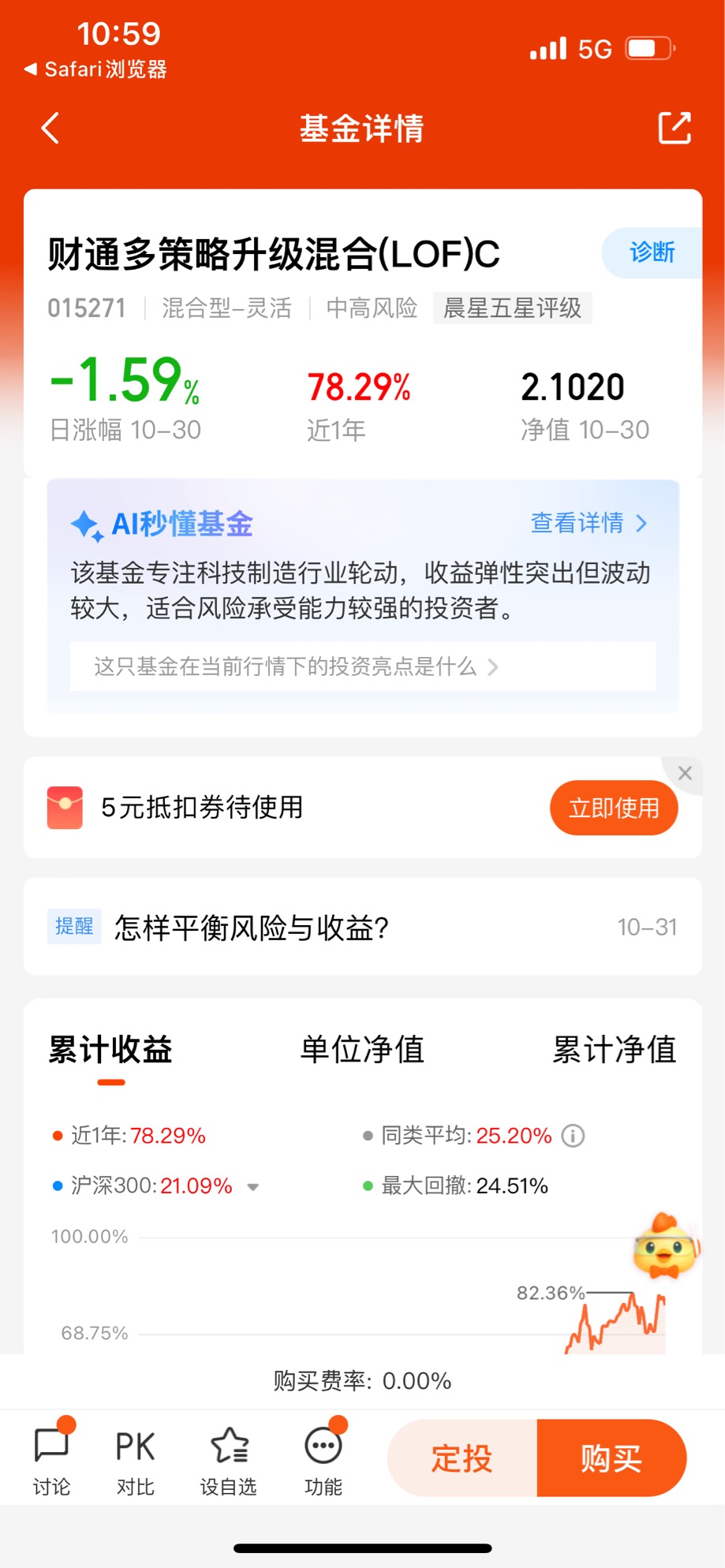 我自己也经历过心态的大起大落。就拿财通多策略升级混合(LOF)C来说,它近一年涨了78.29%,但最大回撤也有24.51%。有一次它跌了15%,我晚上躺在床上翻来覆去睡不着,总想着是不是该卖了。但后来我想通了,我买它就是看中科技制造的长期逻辑,而且我是分批建仓的,成本不算高,只要行业逻辑没变,这点波动我还能扛住。就这么硬扛下来,虽然过程很煎熬,但最后也拿到了不错的收益。这就是心态稳住的好处。