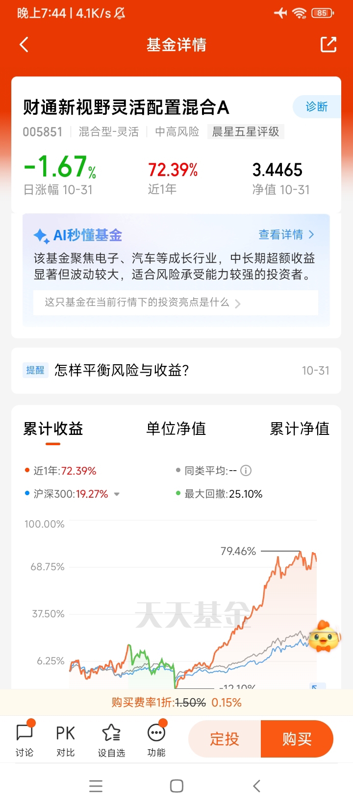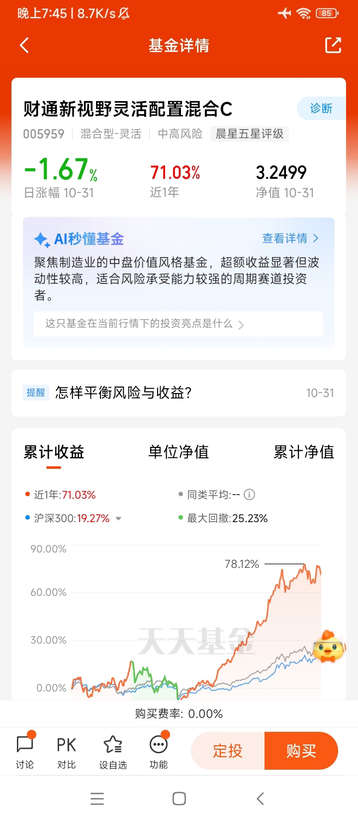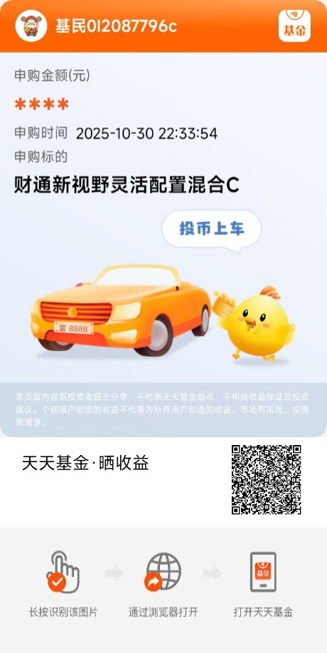 我的风险收益平衡新起点:买入并定投$财通新视野灵活配置混合C$。过去很长一段时间,我都在投资的“左右为难”里打转:看到身边人靠基金短期盈利就跟风入场,结果刚上车就撞上市场回调,本金被套得措手不及;想求稳把钱全存定期,又眼睁睁看着通胀一点点啃食本金的购买力,一年下来收益连物价涨幅都跑不赢。直到反复研究基金产品、对比不同策略后,我最终决定上车财通新视野灵活配置混合C(以下简称“财通新视野C”),并计划开启定投——这一次,我不再追逐短期热度,而是希望以它为支点,找到属于自己的风险与收益平衡点。