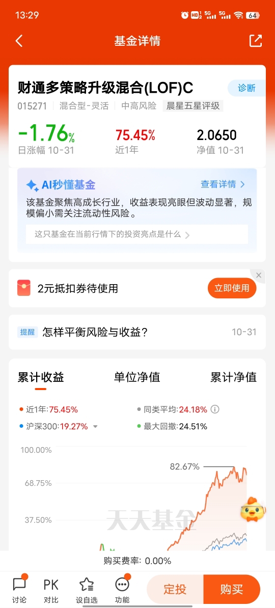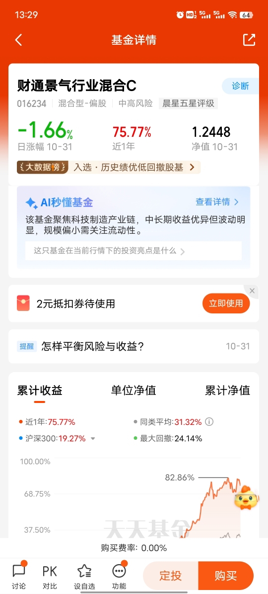 说说我的投资目标,我目前投资基金是打算长期持有,我投资的目的有两个,一个是为自己退休后生活做准备,另一个是打算给子女留一笔可观的财富。离我退休还有20多年时间,目前所有身家都买了基金,目前我和妻子双方父母都有退休金,也不需要我们帮衬,之前把所有财富都买了基金,而且因为银行存款利率太低,跑不赢通货膨胀,目前为了目标还需再投资6年基金,6年后我就不打算再投资基金了,两个账户就建成了。我可以做月光族,我也可以自由支配我的钱财,到那时可以不必为钱财而烦恼了。$财通新视野灵活配置混合C$ @财通基金