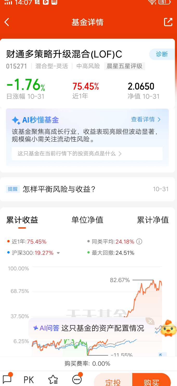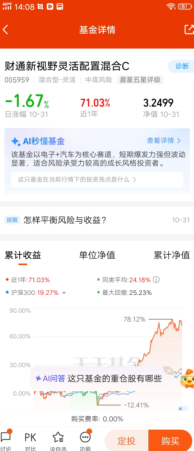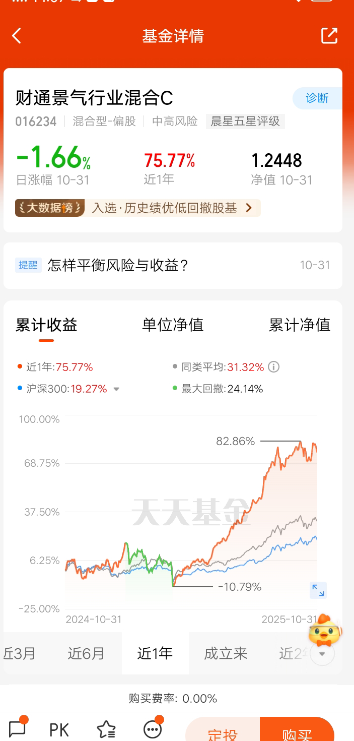风险与收益的平衡点在于资产搭配,各种零相关,负相关的资产组合在一起,可以降低风险带来稳定的收益。$财通新视野灵活配置混合C$ 是一支混合基金,有94.98%的比例投资股票,0.6%的比例投资债券,我认为投资基金在市场好时要学会止盈,在市场低迷时要敢于加仓,耐心持有,有种低买高卖的意思。投资的哲学是与人的正常心里相反的,在投资市场中,会放大人性的弱点,所谓投资就是与自己做斗争,看淡得失,反而会有好的结果。所以要用闲钱投资。@财通基金