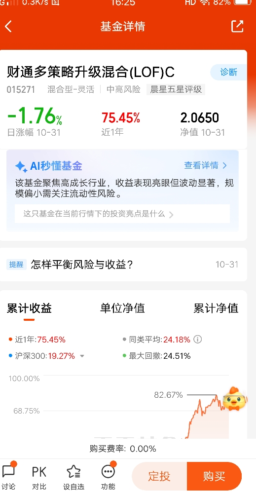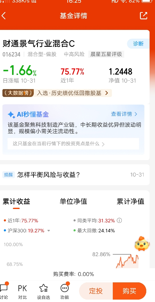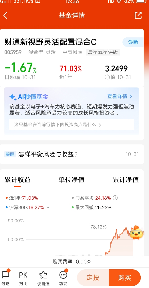 本人再过一天就70周岁了,我投资的目的就是为了增值,由于年龄因素,所以投资基金类别也偏保守,以稳定为主。喜欢风险低的产品,只要比银行定存利息高,我就满足了。$财通新视野灵活配置混合C$ 这支基金是投资电子+汽车赛道为主,今年上涨了67.32%,该基金从2018年成立至今,只有2022年下跌了0.13%,其余年份全部上涨,目前看该基金收益还是很稳定的。@财通基金