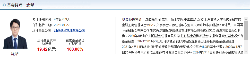 一只基金能不能做好风险与收益的平衡,基金经理绝对是关键。沈犁基金经理的背景和经验让我非常信任。他曾在普华永道、交银施罗德基金和惠理集团等知名机构担任要职,积累了丰富的金融研究和基金管理经验。自从沈基金经理接管这只基金后,他精准的市场判断和灵活的操作策略,使得基金的整体表现十分稳定。从2021年担任基金经理至今,他在不同市场环境下的表现都证明了他的实力。