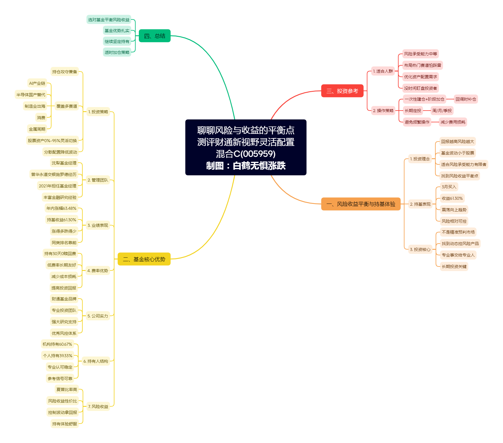 接下来白鹤君我想结合自身对于财通新视野灵活配置混合C(005959)的持基体验,具体聊聊这个话题,并深度测评下财通新视野灵活配置混合C,文章有点长,这里也是做了个思维导图,方便大家整理思路,可以点开放大了看下的。