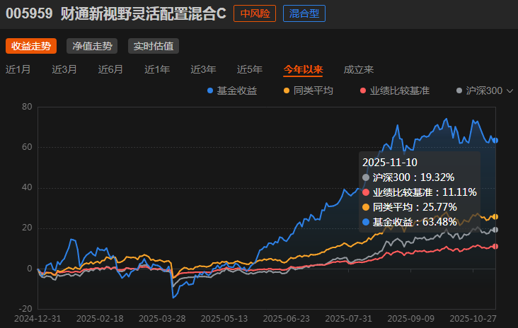 在我个人的投资经历中,财通新视野灵活配置混合C(005959)是一只非常适合我这种投资风格的基金。自从在今年3月份买入了这只基金后,我的收益已经达到了61.30%。说实话,能有这样的回报,既让我感到很满意,又让我对这只基金的投资策略充满信心。它虽然也是一只权益类基金,但在A股这种轮动极快的市场中,其波动并不剧烈,整体趋势是震荡向上的,这对于我来说非常重要。