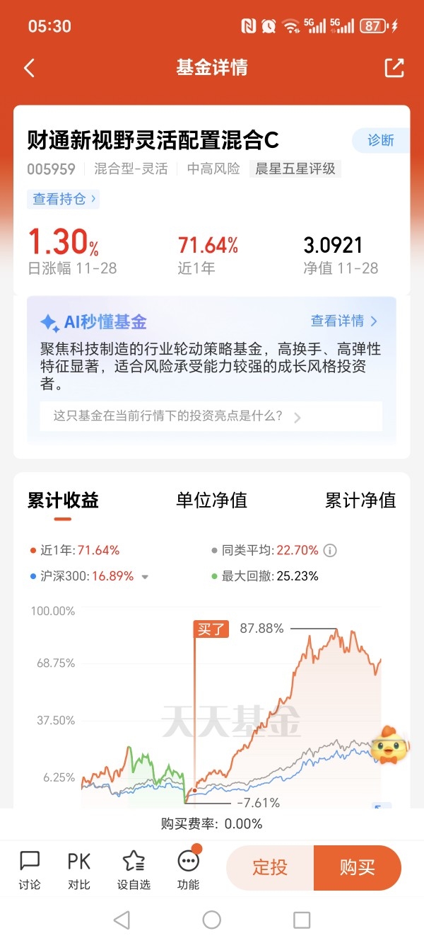 #如何在市场中寻找风险与收益的平衡点# +面对当前市场的快速风格切换,我始终将"风险控制优于收益追逐"作为核心原则,在市场中寻找风险与收益的平衡点。2025年三季度以来,市场呈现科技与周期"两翼齐飞"的格局,但科技板块因机构持仓集中(TMT仓位占比超40%)、估值高企,而周期板块在反内卷政策下迎来供给端优化,例如化工行业产能出清速度加快,落后产能退出规模同比增长23%。这种环境要求投资者在结构上寻找平衡。我通过配置行业分散、注重估值与业绩匹配度的基金,既参与成长机会,又防御潜在回调,从而实现风险与收益的合理匹配。我长期看好财通新视野混合C,该基金由基金经理沈犁管理,他采用全市场选股策略,不押注单一赛道,而是通过精选个股覆盖多个高增长领域。从2025年第二季度报告看,前十大重仓股包括新易盛(通信)、胜宏科技(电子)、春风动力(消费)等,行业分布广泛,且占净值比均控制在合理范围(最高10.77%),这种组合在热点轮动中展现出韧性,近三个月净值增长率达23.56%,显著跑赢基准。基金注重产业趋势,在AI产业链和半导体国产化方向布局,这些领域长期受益于政策支持和渗透率提升,为基金提供了可持续的收益来源。坚持长期布局,源于对市场周期的理解。历史复盘显示,牛市中的风格切换平均持续约12个交易日,但调整后风格延续的概率略高于切换(53.8%),因此短期波动不应干扰长期策略。该基金通过灵活调整仓位(股票投资占比91.21%),在科技板块回调时增持低估值机会,体现了"攻防兼备"的特性。基金公司管理团队稳定性较好,综合评分高于99%的同类基金,增强了我的信任。我通过定期投入,长期持有,避免追涨杀跌而导致亏损,最终在时间复利中分享中国经济多元动能的红利。