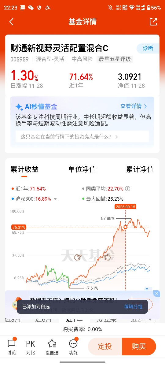 寻找风险与收益的平衡点,首要前提是建立动态适配的资产配置框架,拒绝单一资产的极端押注。不同于股票型基金的高波动与债券型基金的低收益局限,灵活配置基金的核心优势的在于可根据市场趋势灵活调整股债等资产比例,实现“涨时能进攻、跌时可防御”的效果。财通新视野灵活配置混合C精准把握这一核心逻辑,通过对宏观经济周期、市场估值水平及政策导向的综合研判,动态优化权益类与固定收益类资产的配置权重,在市场景气度提升时加大权益仓位捕捉成长收益,在市场波动加剧时增加稳健资产占比严控回撤,从底层配置上构建风险与收益的平衡基础,其近12个月71.64%的涨幅与阶段性波动控制的表现,正是这一配置逻辑的直观印证。