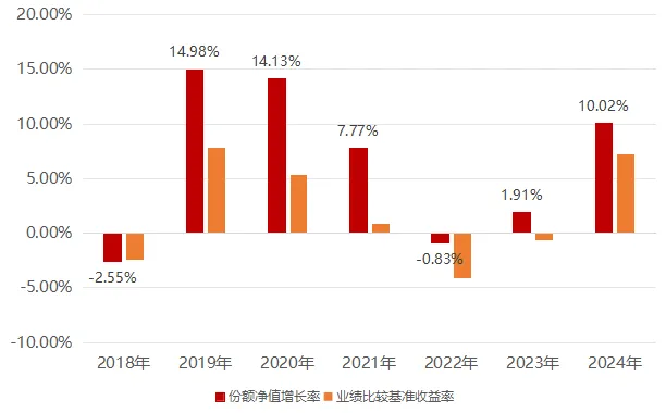 注:数据来源于东方红配置精选混合基金2018-2024年年报。业绩比较基准为:沪深300指数收益率20%+中债综合指数收益率80%。2018至2024年,该基金年度业绩比较基准收益率分别为:-2.43%、7.80%、5.32%、0.87%、-4.06%、-0.64%和7.24%。历任基金经理:徐觅(2018.05.21—2024.03.11)、孔令超(2018.05.21至今)