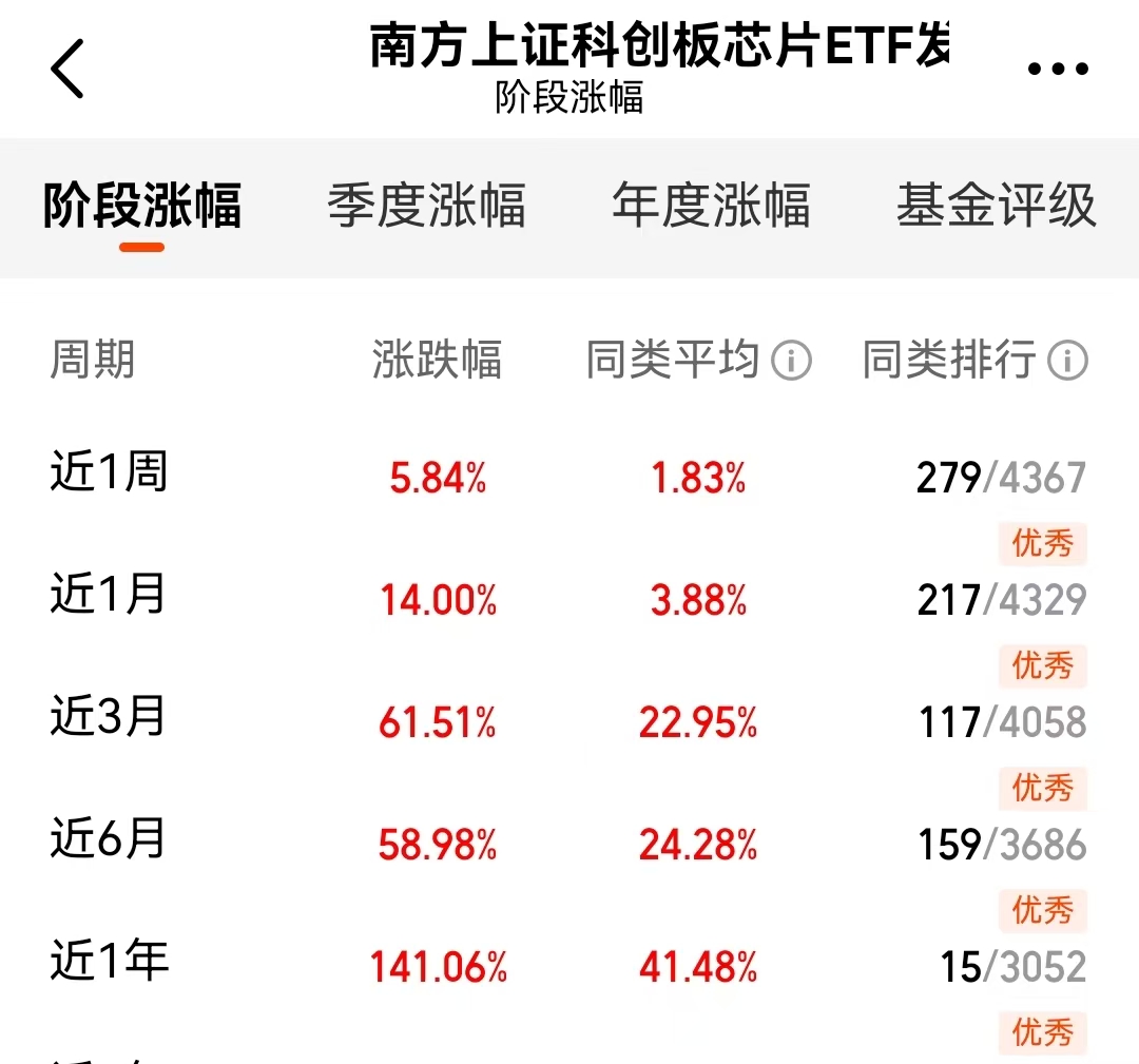这段时间市场表现不错,不少人都想着怎么跟上。芯片作为科技创新的重要部分,热度持续。我看$南方上证科创板芯片ETF发起联接A$(021607)就不错,近三个月涨61%,近一年涨141%,同类产品里拔得头筹。它的策略就是紧跟相关指数,指数里的成分股都是芯片产业链上的公司。用这种方式,可以一次性布局一批相关企业,不至于错过板块整体的机会。当前环境下,这类工具或许是个不错的选择。#DeepSeek、寒武纪同步发布引关注#
