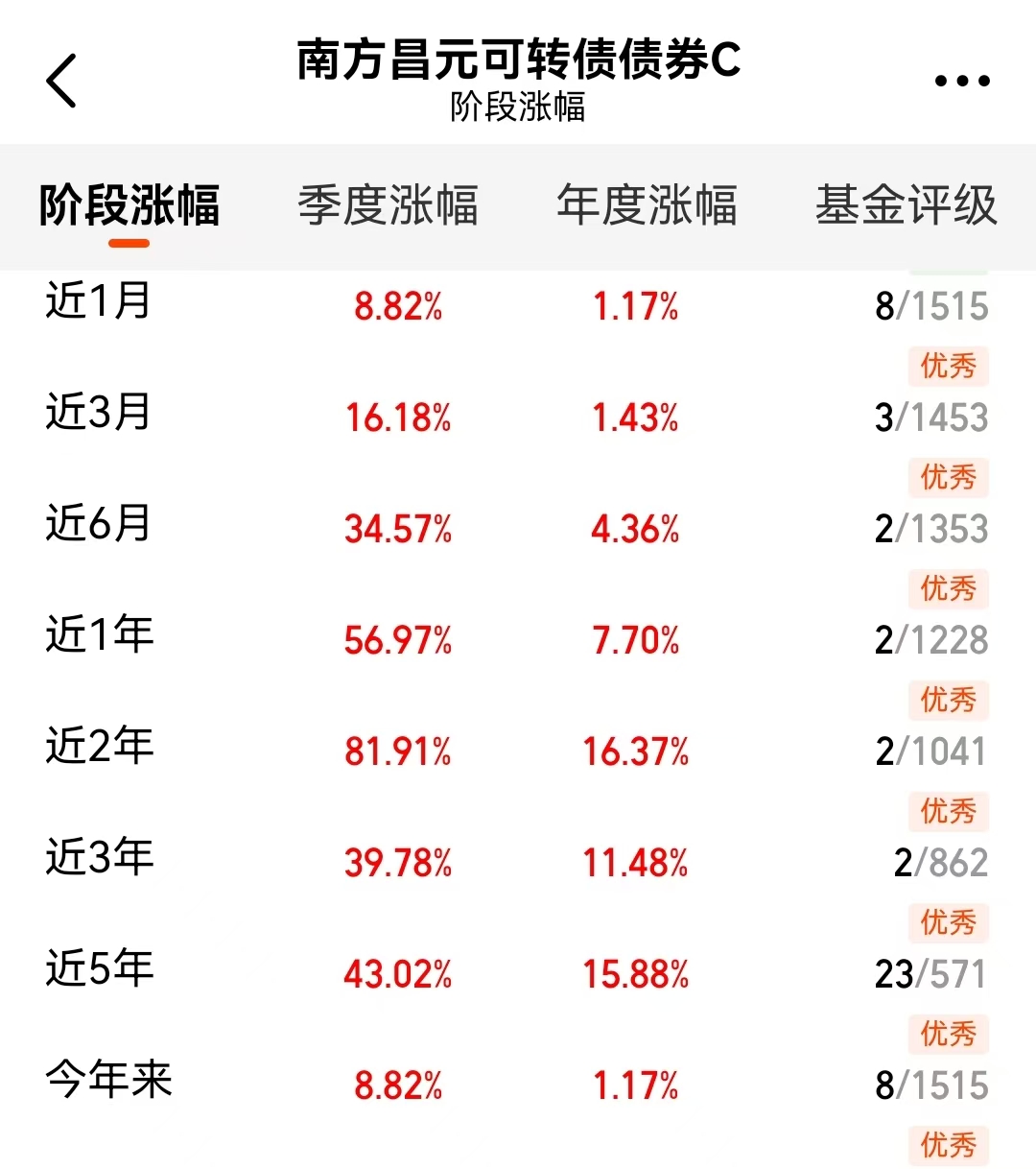如果既想把握市场机会,又对大幅波动有所顾虑,可以了解一下$南方昌元可转债债券C$(006031)。它近一年涨了57%,在众多债基中排名第一,这个长期成绩单比较出色。基金主要通过可转债投资,尤其偏向科技领域,兼顾一定的防守性和增长潜力。近期市场有所表现,这类产品可能提供一种折中的参与方式。但需要清醒认识的是,可转债基金的波动性显著高于普通债基,前两日的市场回调中也有所体现,因此决定前请理性判断自身的承受能力。#2月基金投资策略#