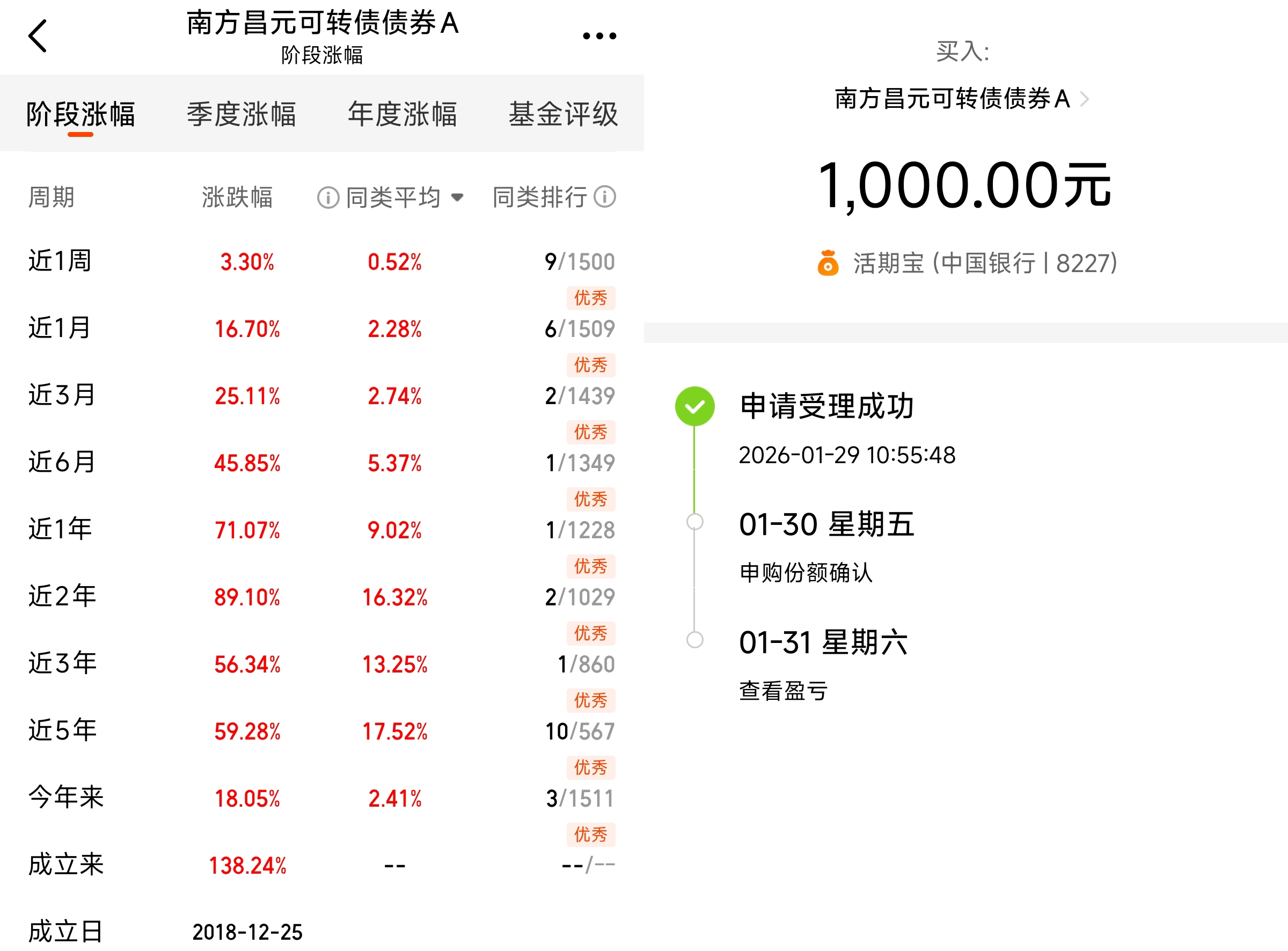 以南方昌元可转债基金为例,这是一只成立7年的混合二级债基(固收+基金),其中股票仓位占比19.72%,可转债占比超91%,持仓行业较为分散,前十大股票涵盖电子、电力设备、半导体等6个行业,与转债持仓形成科技赛道联动,重点挖掘科技成长和周期行业龙头的投资机会,近一年收益率71.07%,在同类基金中排名第一,超额收益明显。