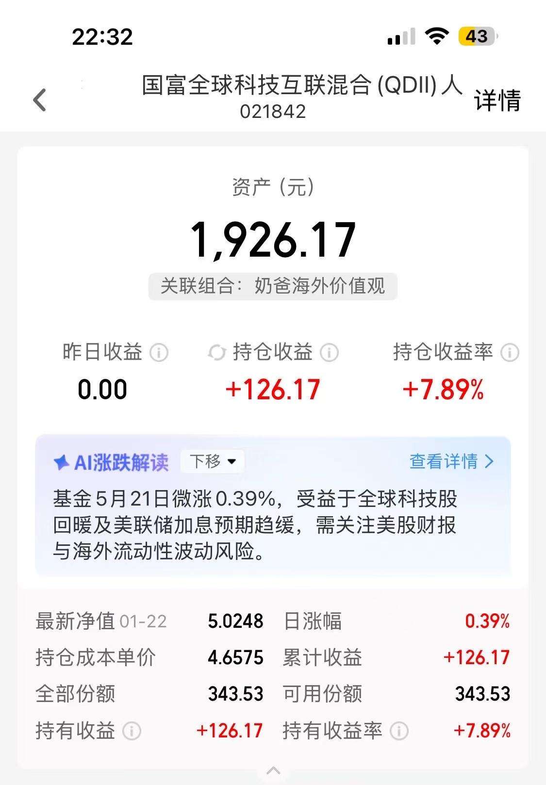 国富科技这只目前持仓的美股主动基中表现最好的一位,可惜限购100。$国富全球科技互联混合(QDII)人民币C(OTCFUND|021842)$