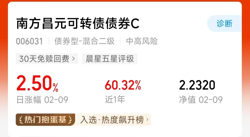 从业绩数据来看,这只基金的表现更是无可挑剔。2025年以48.77%的业绩领跑同类,截至2026年2月6日,今年收益率已达11.80%,近三个月上涨21.07%,成立以来涨幅更是超过123.20%。当前市场流动性充裕,科技领域利好持续催化,周期板块盈利回升预期增强,转债市场的良好态势还将延续。对于普通投资者来说,在高位震荡市场中,既能享受科技、周期板块的成长红利,又能依靠债底保护控制风险,南方昌元可转债006031无疑是最优选择之一,跟着优质基金经理,把握春节前的布局机会。