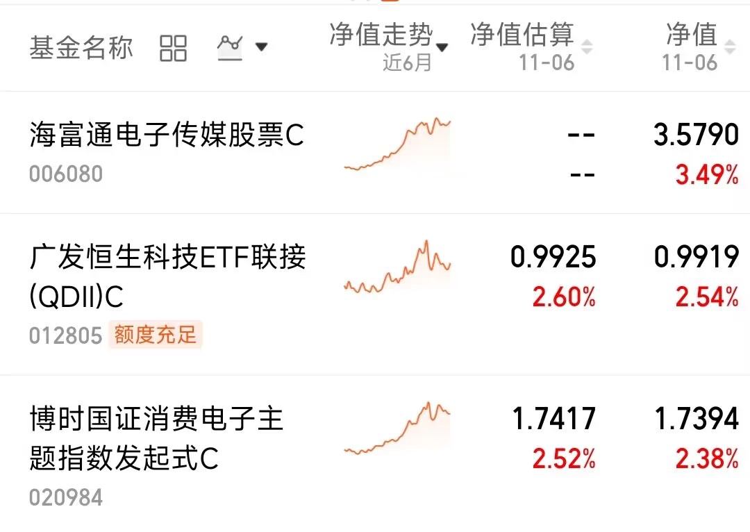 虽然说半导体板块的利好刺激着半导体板块的上涨,但实际利好结合三季度的财报,消费电子才是吸引资金的主要板块,毕竟利润在那放着,实打实的。$海富通电子传媒股票C(OTCFUND|006080)$今天上涨3.49%,$广发恒生科技ETF联接(QDII)C(OTCFUND|012805)$上涨2.54%,$博时国证消费电子主题指数发起式C(OTCFUND|020984)$上涨2.38%。
