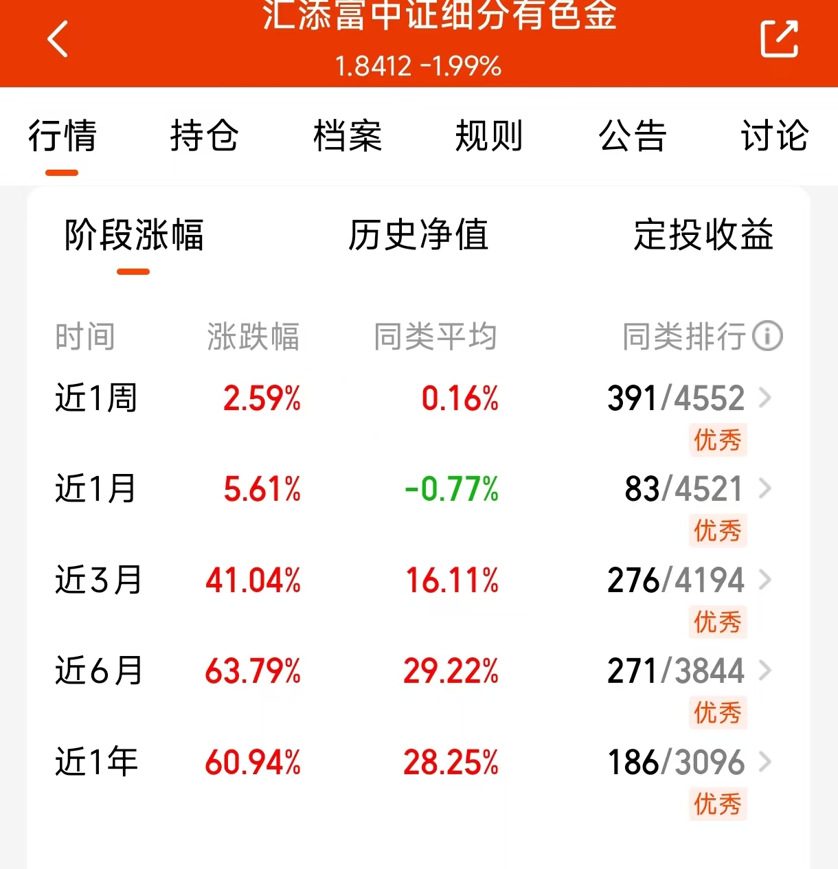 有时候投资不用搞得太复杂,抓住主要矛盾就行。比如现在,铜的供需情况就挺明朗的,而$汇添富中证细分有色金属产业主题ETF发起式联接C$(019165)是目前全市场随着铜含量最高的指数基金(30%铜+14%黄金)。这只基金近期表现很能说明问题,近一周涨2.59%领先华夏有色金属C(016708),而且近半年涨67%以上,位居前列。现在供应端限制多,新项目投产慢;需求端有韧性,相关领域带来新增长点。这种行情一旦形成,没那么容易改变,11月依然值得期待,逢低关注或许是个思路。#能源金属概念狂飙!锂电大周期来了?#
