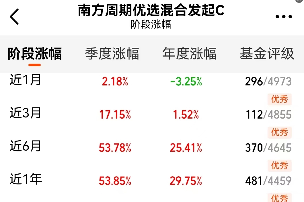 天天基金,$南方周期优选混合发起C$(021712)今天净值又往上走了,我手里那点份额也跟着值钱了一点。这基金从成立到现在,差不多一年零两个月,总的收益已经超过50%了,这成绩在我看来是相当可以了。想想现在的经济,有点像从慢下来到慢慢恢复的过程,这个时候,那些对经济变化比较敏感的行业,比如一些基础的材料、工业,可能就会先动起来。这个基金重点就是布局这些领域,我觉得时机挺对的。我自己买了点,也是觉得后面可能还有机会,短期涨了点当然开心,但更看好它长期的布局。#12月基金投资策略#