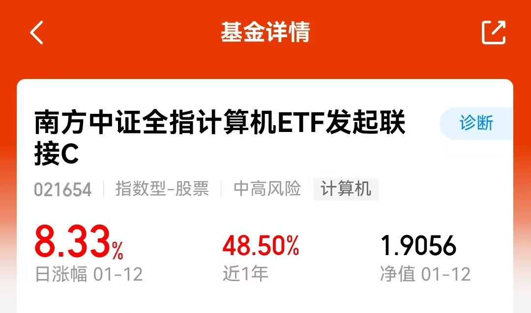 看看$南方中证全指计算机ETF发起联接A$(021653)的走势,近一年48.73%的收益确实让人心动。昨天单日净值就涨了8%以上,这种爆发力体现了计算机行业的弹性。这个指数主要覆盖软件开发、IT服务、计算机设备等领域,这些都是数字经济的基础。当前社会数字化转型是个长期趋势,无论是企业还是个人,对科技服务的需求都在增加。这样的指数工具让普通人也能间接参与到这个趋势中。当然,短期涨多了可能会有调整,但长期看,计算机行业的发展前景还是比较清晰的。#17连阳!A股日成交达3.6万亿元创历史新高#