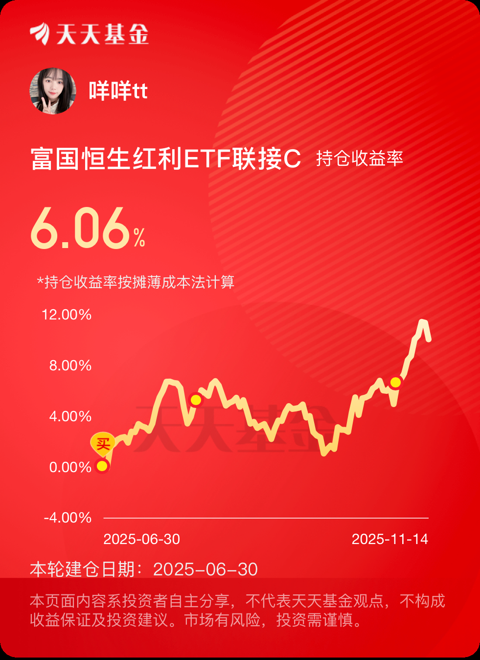 “成长为矛、红利为盾”的策略依旧没变,我底层配置依旧不会落下红利资产,低估值+高股息的防御属性,与当前市场的避险需求高度契合,在当前低利率市场环境下,红利资产不惧波动可以吃到稳稳股息,这也是红利资产的底气所在。富国恒生红利ETF联接C聚焦港股上市的红利资产,股息率更高,估值显著高于中证红利等指数,在红利风格占优的时候弹性也更大一些。本月富国恒生红利指数最长实现8连涨,净值也拿下新高,近1年涨幅超过30%,咩咩之前布局的仓位也盈利6%+,趁今天震荡整理,我再加一份。
