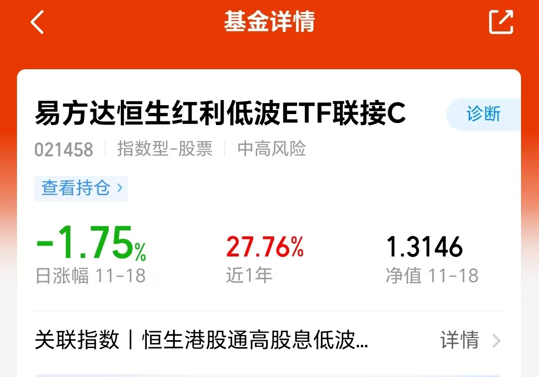 今天A股和港股窄幅震荡,最近市场波动大、板块切换飞快。年底机构要收官考核,风险偏好会降低,大家都想获利了结,大概率会切换到防御板块。我特意调整了配置思路,打算加仓 易方达恒生红利低波C,它是低波动红利型,股息率能到 6%。给持仓加道波动 “减速带”,既能稳住年末节奏,心里也更踏实,后市我还挺看好这类防御性标的。