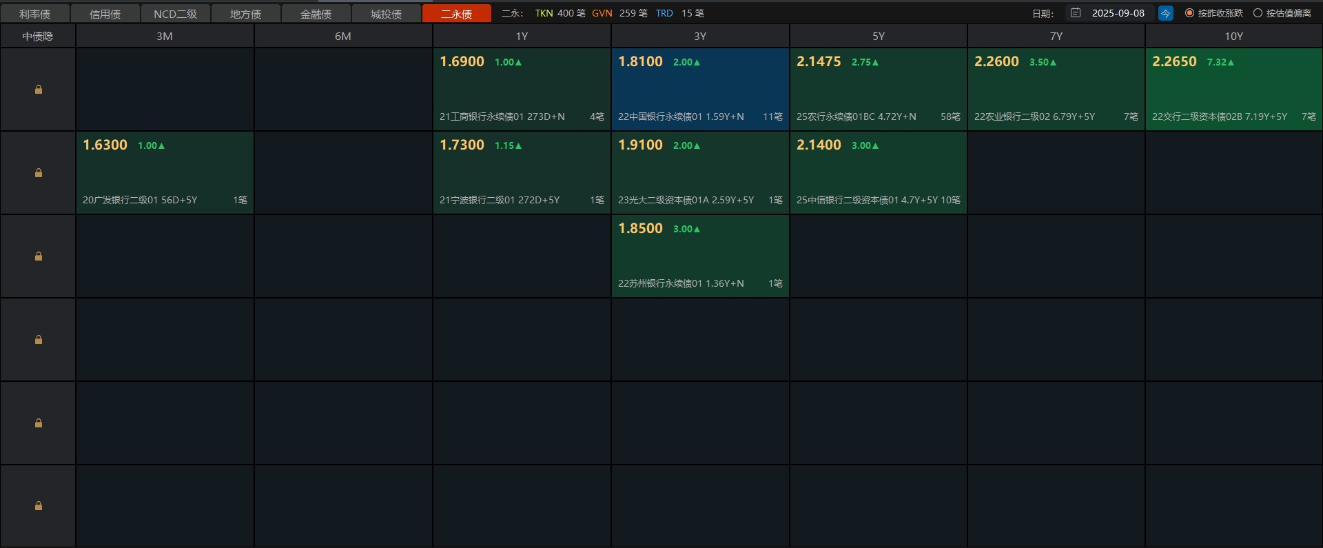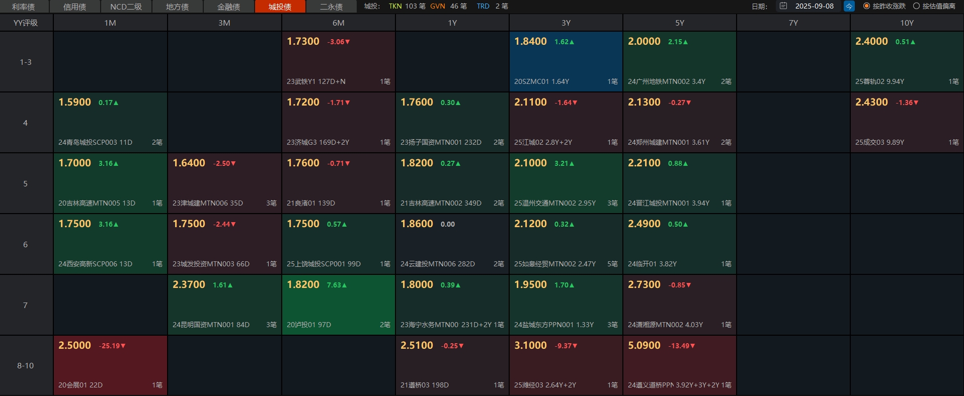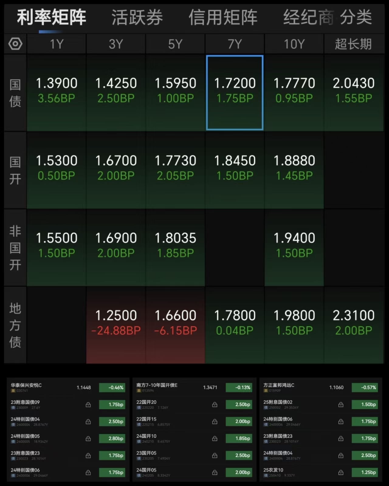 09月08日债市午间天气播报:今天隔壁大盘表现依然强势,3300多家上涨。虽说盘中部分高标板块震荡,但消费、猪肉、人形机器人和电池存能等板块走势较好。债市这边,受股债跷跷板效应影响,利率债延续震荡。信用债叠加周末票息小震荡,其中银行债长端偏弱,跌幅稍大。我今天的加仓方向依旧是稳健型固收+,顺带建仓一笔消费板块的仓位。午盘情况:7-10年期国开债碎蛋16-20个,超长期国债轻仓碎蛋33-38个(华子),重仓碎蛋39-45个蛋(方正)。