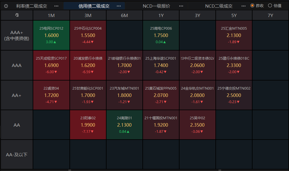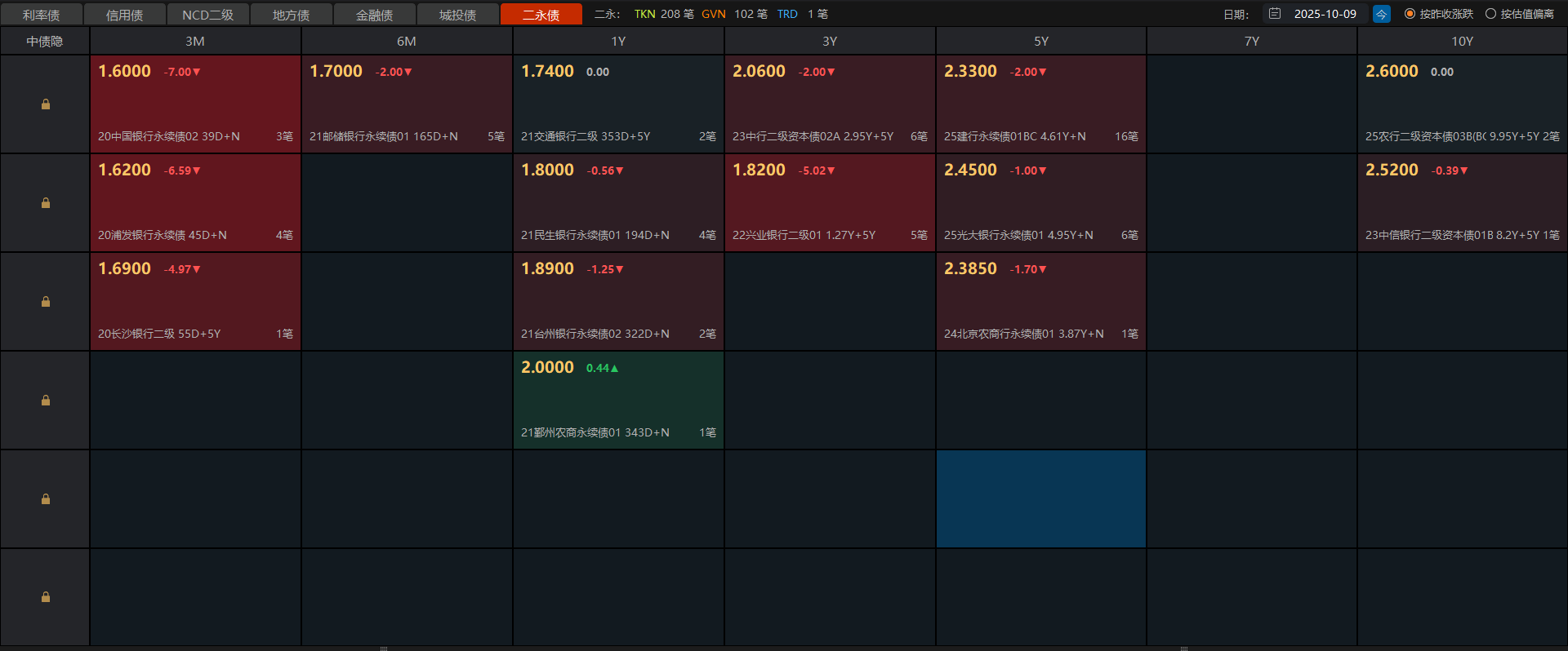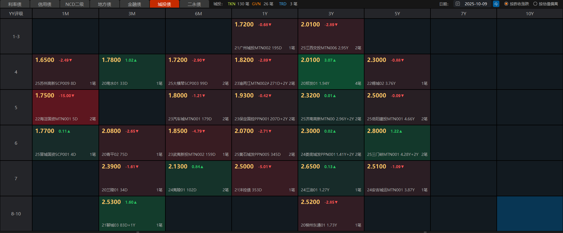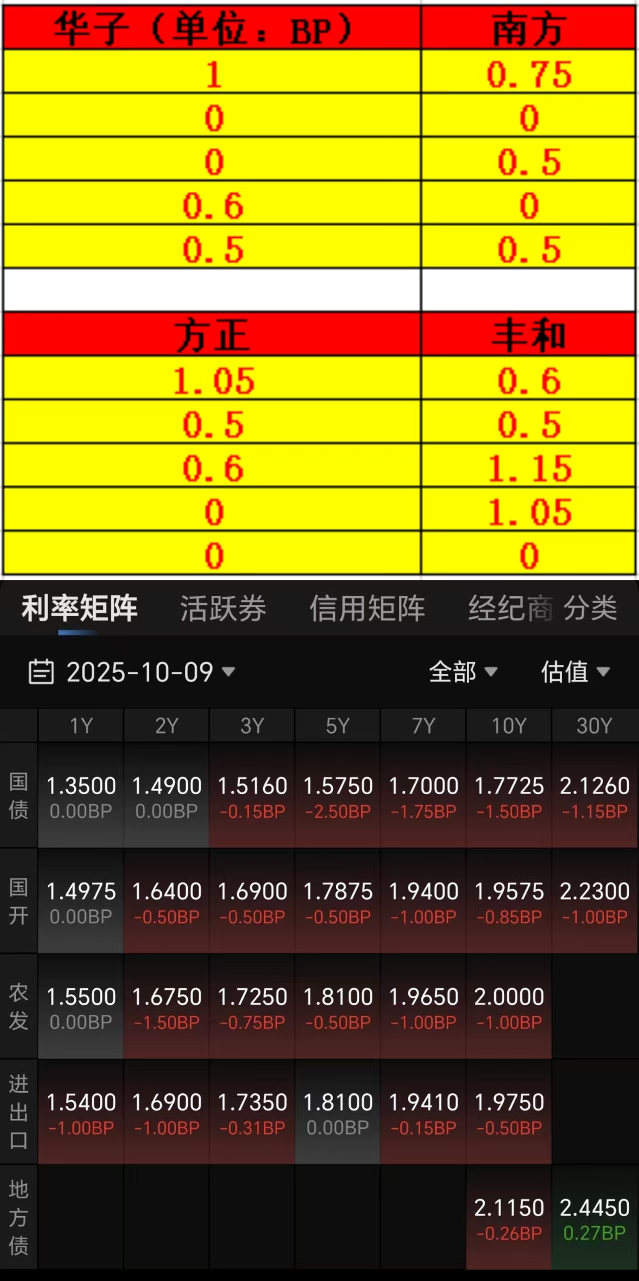 10月09日债市午间天气播报:上半场结束,隔壁大盘延续强势,放量上涨。可转债目前表现也不错,但个股分化,3200多家上涨,二千多家飘绿。科创芯片和有色金属板块涨势喜人,涨幅超6%。债市这边,基金在11:40以后转为买入,证券是买方主力。利率债整体小涨为主,信用债中城投债长端稍弱一些,短端表现稍好,银行债小涨状态。午间情况:7-10年国开债收蛋7个左右,超长期国债轻仓收蛋10个左右(华子),重仓收蛋15个左右(丰和<方正)。