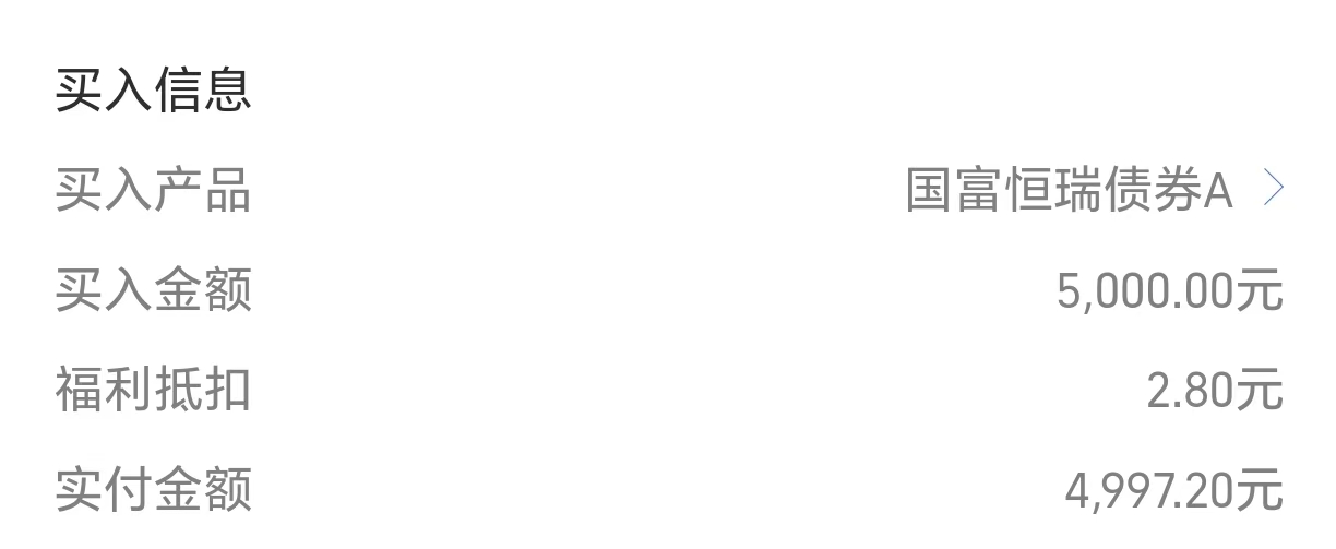 $国富恒瑞债券A(OTCFUND|002361)$+5000,讨论区领了一个满减包,昨天逆势收15个蛋,我今天决定继续加一笔。虽然今年以来权益市场较强,但波动也大,好在我大部分持有的混债是稳健型的。市场虽说长期趋势是震荡着往上走,但后续波动是常态。个人投资策略还是以稳健为主,小部分仓位配置高波动基金增厚收益,大仓还是稳健型固收+。国富恒瑞是一只偏稳健型的固收+,股票和可转债的仓位占比34%左右,债券以利率债为主。整体回撤控制较好,比多数同类波动小,收益又比大多纯债高。我目前已经陆续配置一部分持仓,当货币基金放着,长期跑赢货币基金就可以。