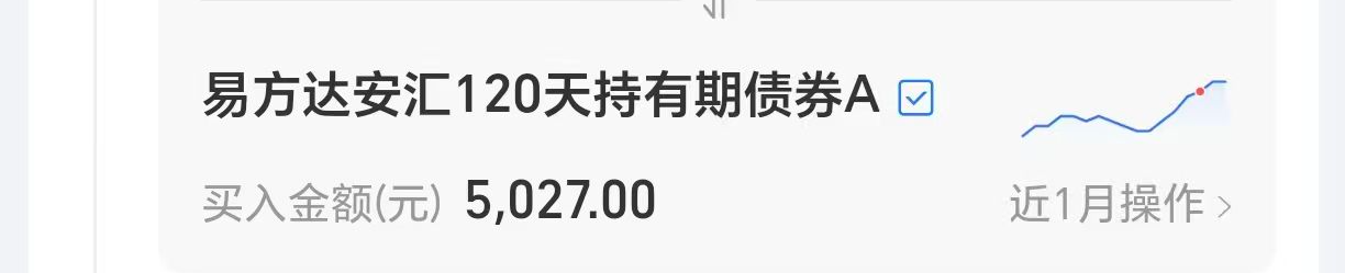 $易方达安汇120天持有债券A(OTCFUND|019579)$+5000,今年行情震荡频繁,不光磨心态,关键忙了大半年,好多纯债基金还是负收益。我决定继续优化一下持仓,一部分不常动的持仓配置稳健型基金,跑赢货币基金就可以了。这只基金主投1-3年久期的信用债,票息收益相对稳定。今年以来收益1.25%,优于多数同类基金。信用债票息收益一般比利率债要高不少,按1年2%-2.9%的票息收益,还有资本利得。而且四季度银行和保险等机构一般会求稳,避免年末业绩波动,会更倾向增配债券以锁定收益,我还是比较看好后续修复行情。准备一部分持仓安稳吃票息,低波动体验感更好一些,A类也不用频繁操作。今天,我决定再追加一笔。