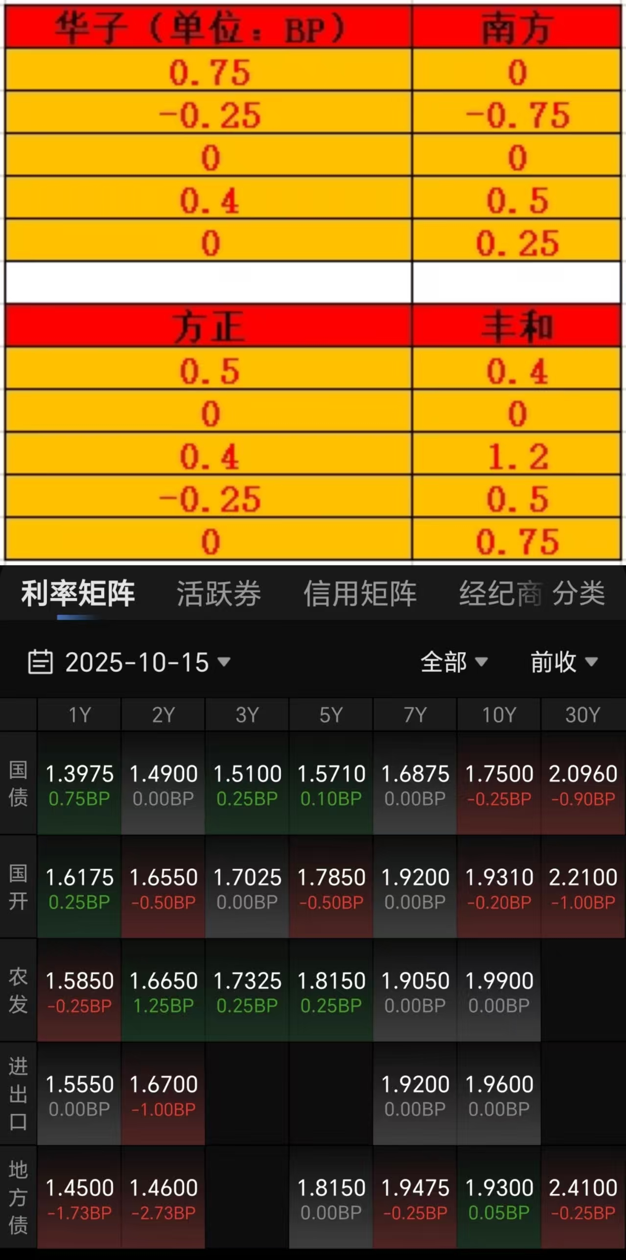 10月15日债市午间天气播报:盘中震荡起起落落,隔壁大盘缩量6000亿,部分板块冲高回落。个股分化,1946家下跌,3295家上涨。债市这边涨跌互现,整体小震荡状态,利率债长端有拉升迹象。从分歧指数来看,基金是买方主力,证券是卖方力量。隔壁当前不少板块参与拥挤度较高,后续震荡将成常态。个人操作上仍以稳健为主,做好高低搭配。毕竟盲目追高面临的波动也更大,合理配置提升持仓体验感。午间情况:7-10年国开债0-2个蛋,超长期国债轻仓收蛋7-9个(华子),重仓收蛋10个左右(方正)。