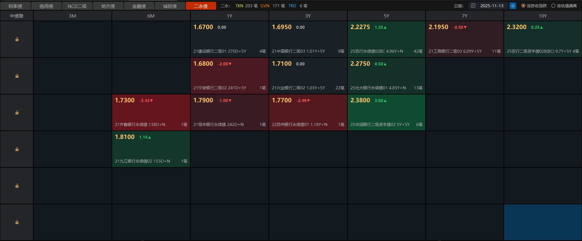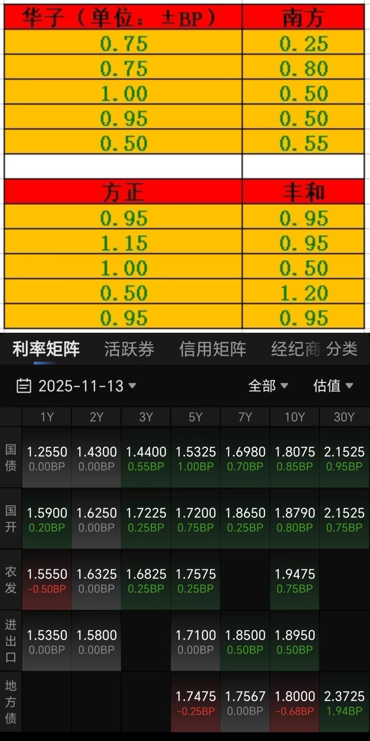 11月13日债市午间天气播报:上半场结束,隔壁大盘总算迎来修复,电池存能、有色金属和细分化工发力,涨势喜人。个股涨跌互现,1416家下跌,3835家上涨。债市这边又有点蔫了,基金和证券处于卖出状态,银行和保险配置盘是买方力量。利率债整体震荡幅度不大,超长期国债稍大一些。城投债表现平稳,银行债偏弱,整体小涨小跌状态。午间情况:7-10年国开债碎蛋5个左右,超长期国债轻仓碎蛋12-15个(华子),重仓碎蛋16-22个(丰和<方正)。