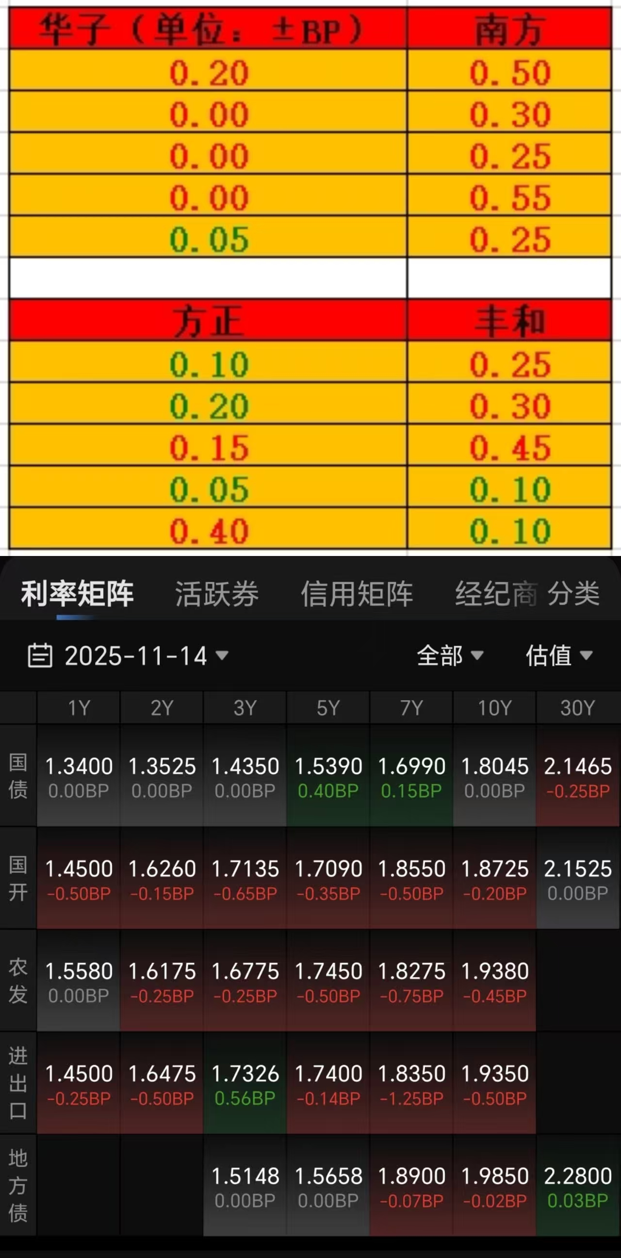 11月14日债市午间天气播报:上半场隔壁大盘跌势稍稍放缓,个股分化,2523家下跌,2856家上涨。债市这边,表现只能算一般般吧。利率债小蛋行情,7年期以内国债偏弱一些。最近信用债的体验感会更好一些,没有大起大落的情况,票息收益也相对稳当。个人操作还是以稳健布局为主,股基小仓位玩玩,大部分仓位放在纯债里了。午间情况:7-10年国开债收蛋2-4个左右,超长期国债收蛋0-3个(华子和方正)。