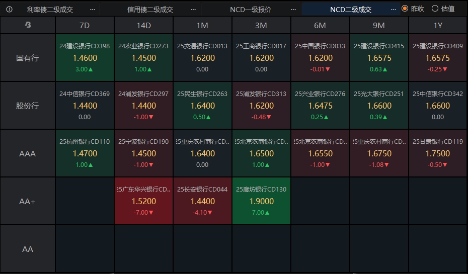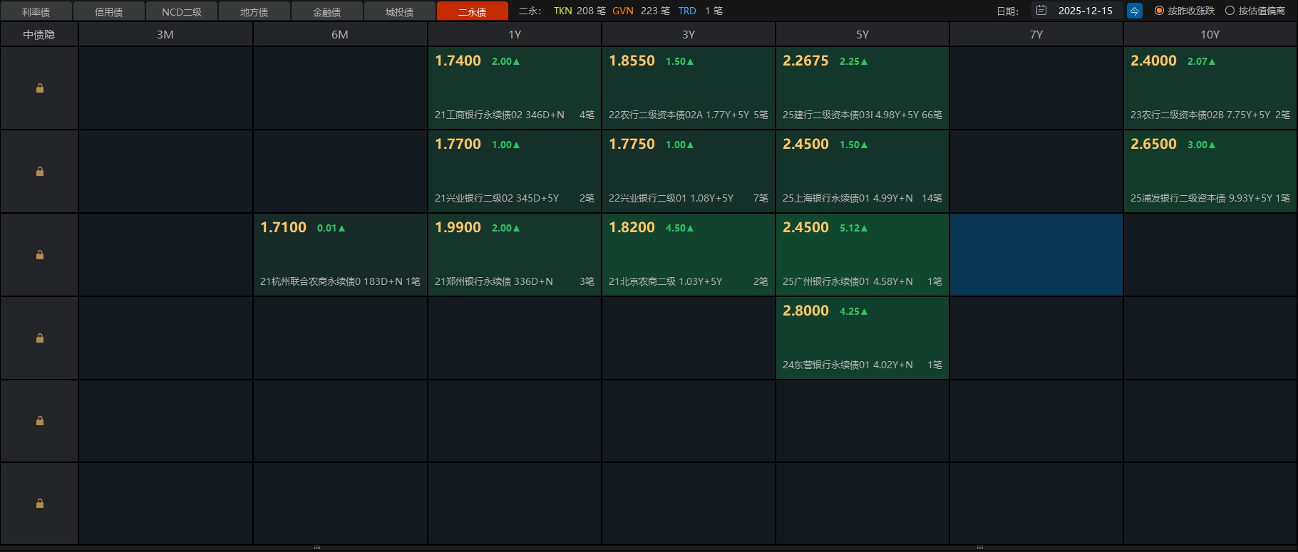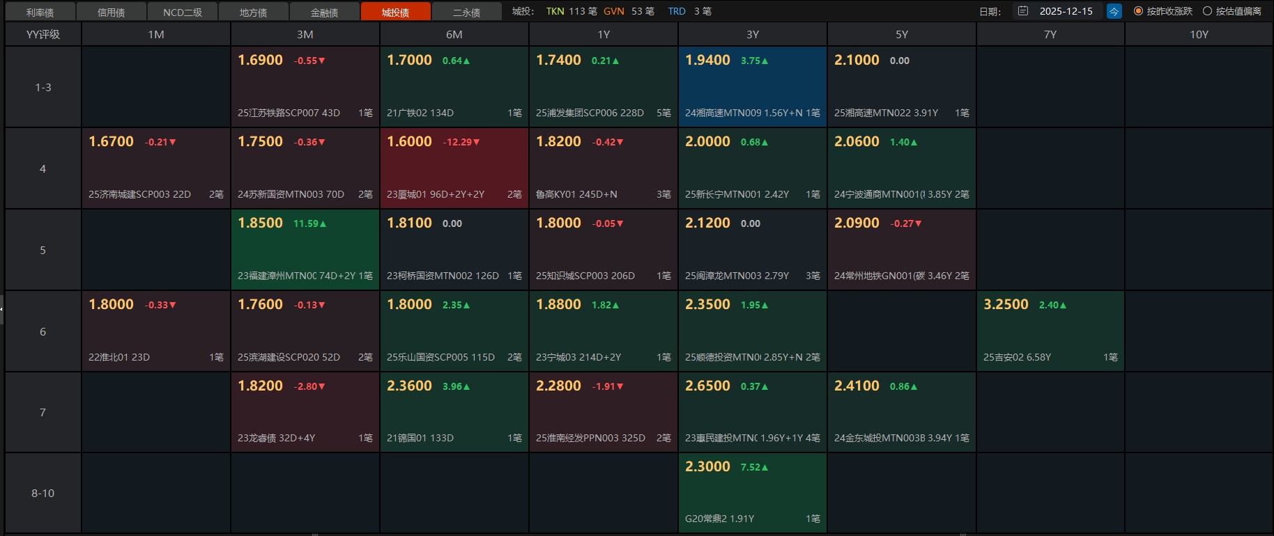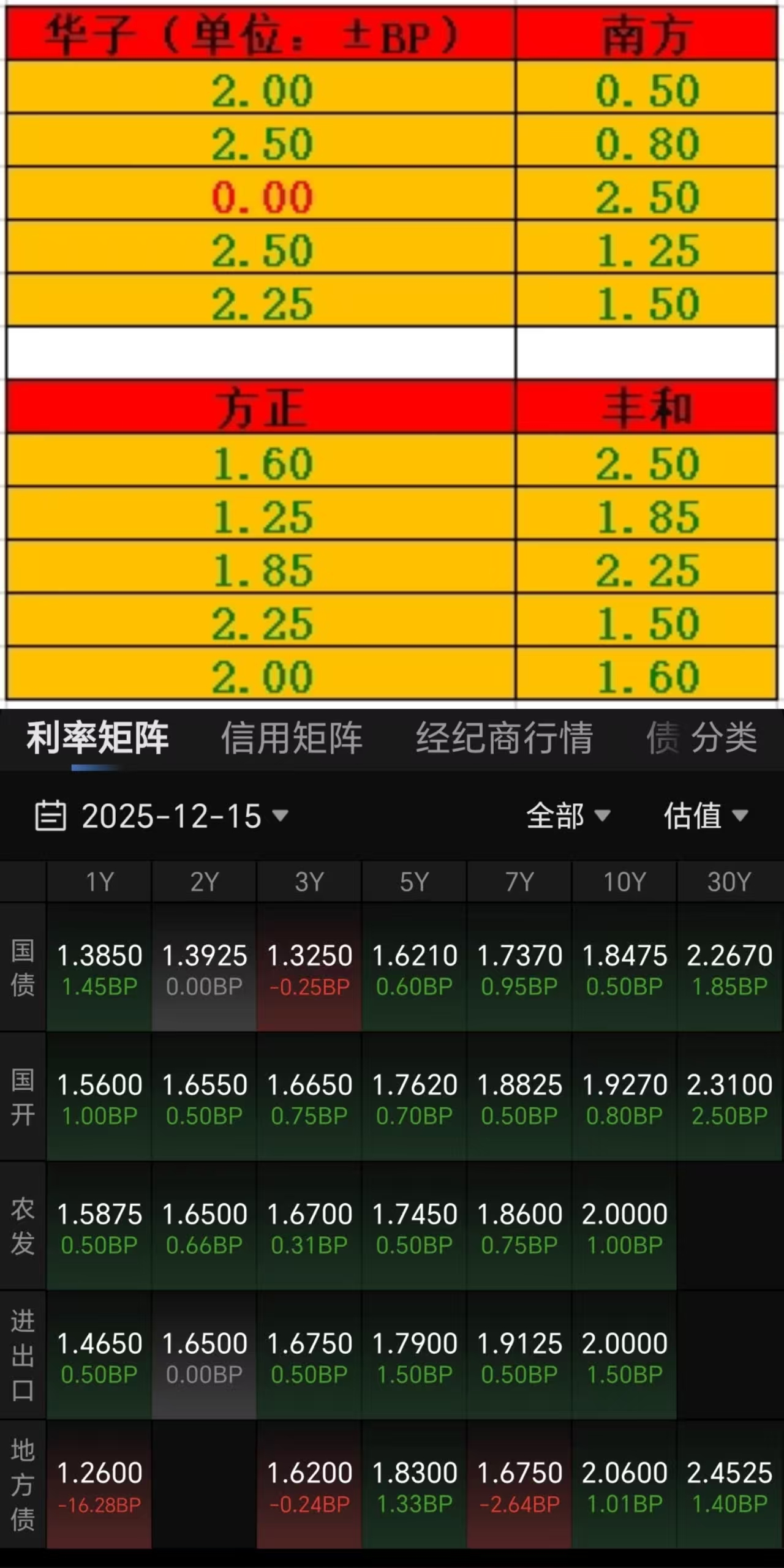 12月15日债市午间天气播报:上半场股债双震荡,可转债跌势稍稍放缓。2666家个股上涨,2588家下跌,科创和创业板偏弱,微盘股表现稍好。债市这边,基金一直处于卖出状态,保险、银行是买方力量,证券转为卖出;超长期国债跌幅稍大,信用债叠加周末票息支撑窄幅波动(多数-3到2个蛋之间,小部分+利率长债碎蛋4+个),短端小部分城投债上涨,银行债中长端偏弱。年底市场震荡频繁,个人依然偏向稳健布局,高波动的基金暂时不加仓了。午间:7-10年期碎蛋6-11个,超长期国债轻仓碎蛋38-43个(华子),重仓碎蛋43-50个(方正、丰和)。
