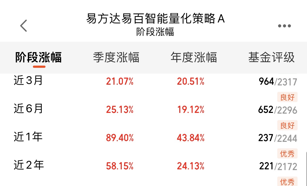 最近量化策略的表现真亮眼,易方达易百智能量化策略A近3个月收益21.07%,近一年收益更是高达89.4%,走势非常稳健且领先同类产品。相比普通量化基金,它在选股模型、风险控制和板块轮动上都有更高灵活性,抓住市场结构性机会能力更强。对于想通过量化策略参与市场、又希望兼顾稳健收益的投资者来说,这类“更强的量化”正是理想选择,长期来看还能享受复利效应,同时避免追高踩雷的风险。