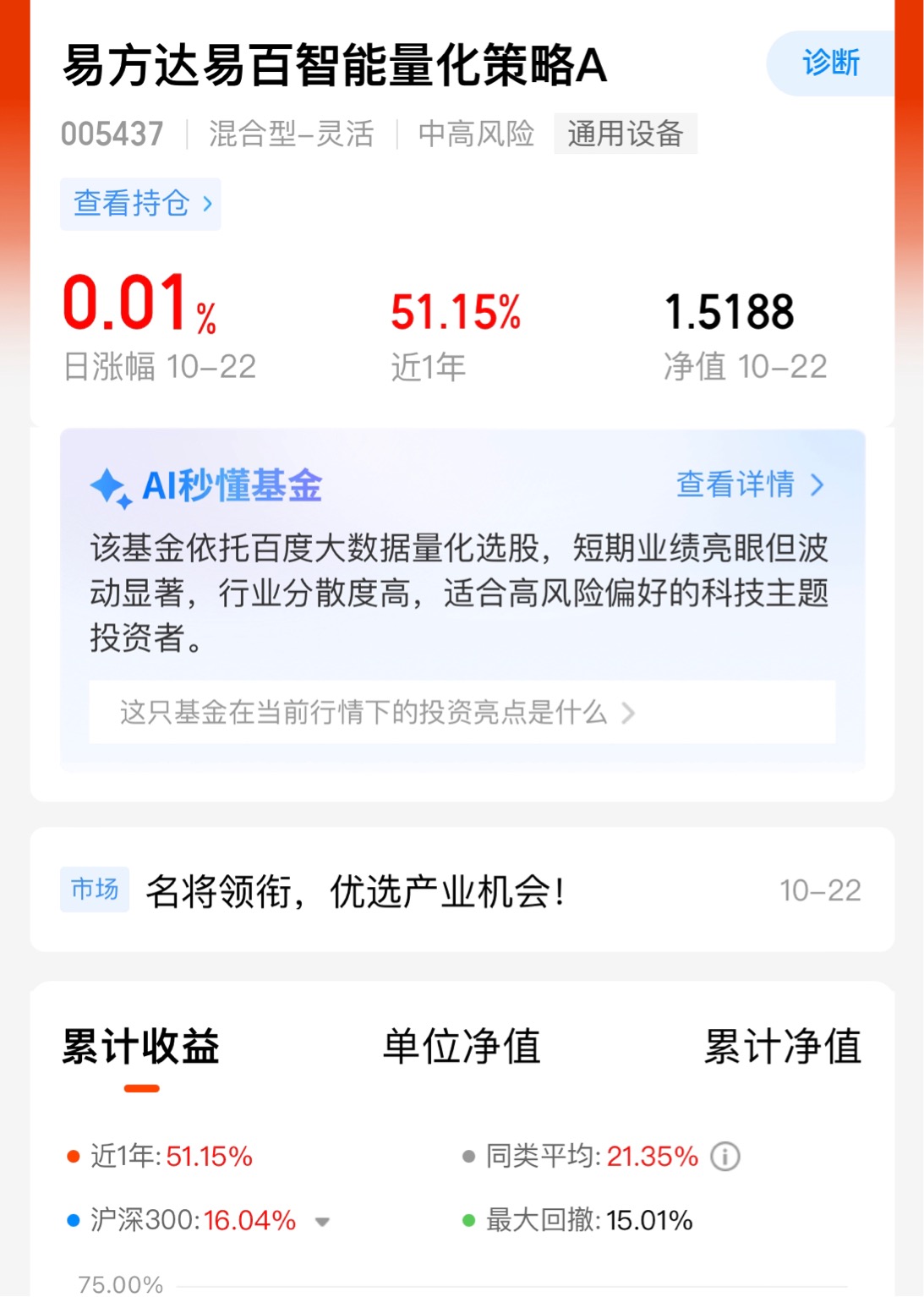 最近市场震荡走势,板块轮动也快,我手里的易方达易百智能量化策略A,它靠量化模型覆盖多行业标的,既能分散单一板块风险,又能精准跟行情节奏。