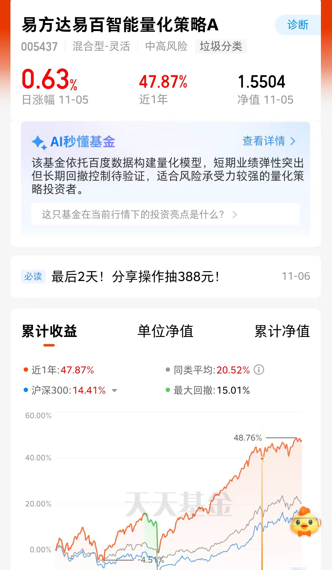这两天股市行情反弹了,牛市行情反弹快,但是在牛市行情里板块轮动快,量化策略就不怕轮动,通过高频调仓紧跟行情呢。易方达易百智能量化策略A就是采用量化策略,有效应对板块轮动,跑赢大盘指数呢,值得关注。
