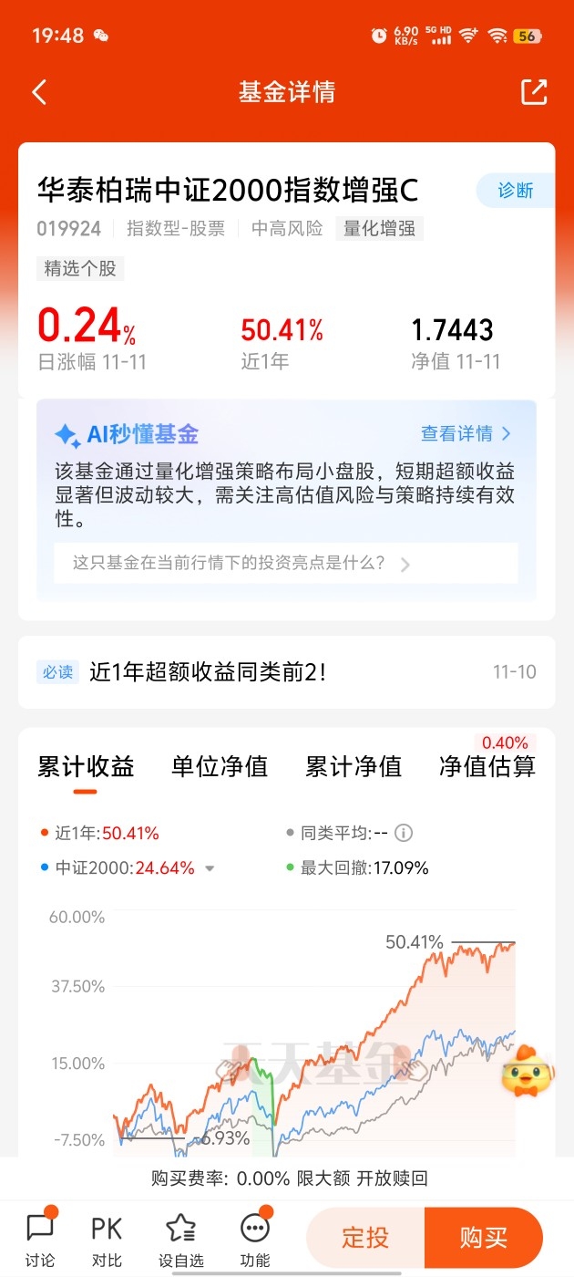 今天A股的分化也太明显了!一边是大盘指数高开低走集体收跌,科技、电子这些前期热门板块领跌;另一边是小微盘、中小盘股逆势上攻,好多小票都在悄悄涨。这其实和11月的市场环境很契合,现在没什么宏观大消息指引,市场对下一个方向没达成共识,题材股炒作活跃,正好给微盘策略创造了机会。而且从这几天的走势看,微盘股指数天天有涨幅,赚钱效应比大盘股好多了。华泰柏瑞在这方面可是行家,它家的2000指增量化超额特别明显,近一年A类超额收益同类第一,想抓住小微盘的机会又怕踩雷的话,选它家准没错,提醒大家投资有风险,入市需谨慎。#科技小登大揭秘# $华泰柏瑞中证2000指数增强C$