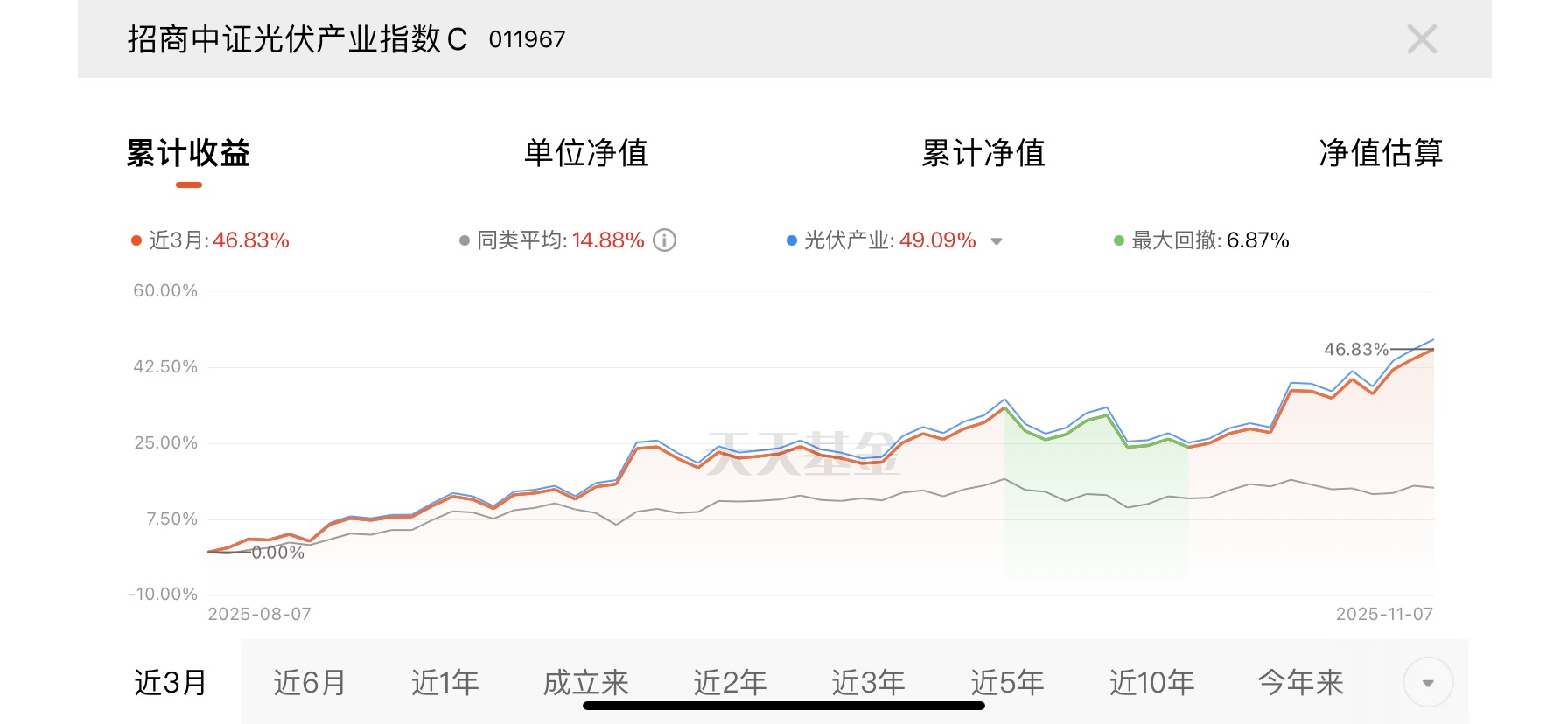 现在大家都注重节能环保,光伏作为清洁无污染的能源,越来越受重视。招商中证光伏产业指数C近3个月涨了46.83%,贴合大众对绿色能源的需求,投资它既省心又有意义。