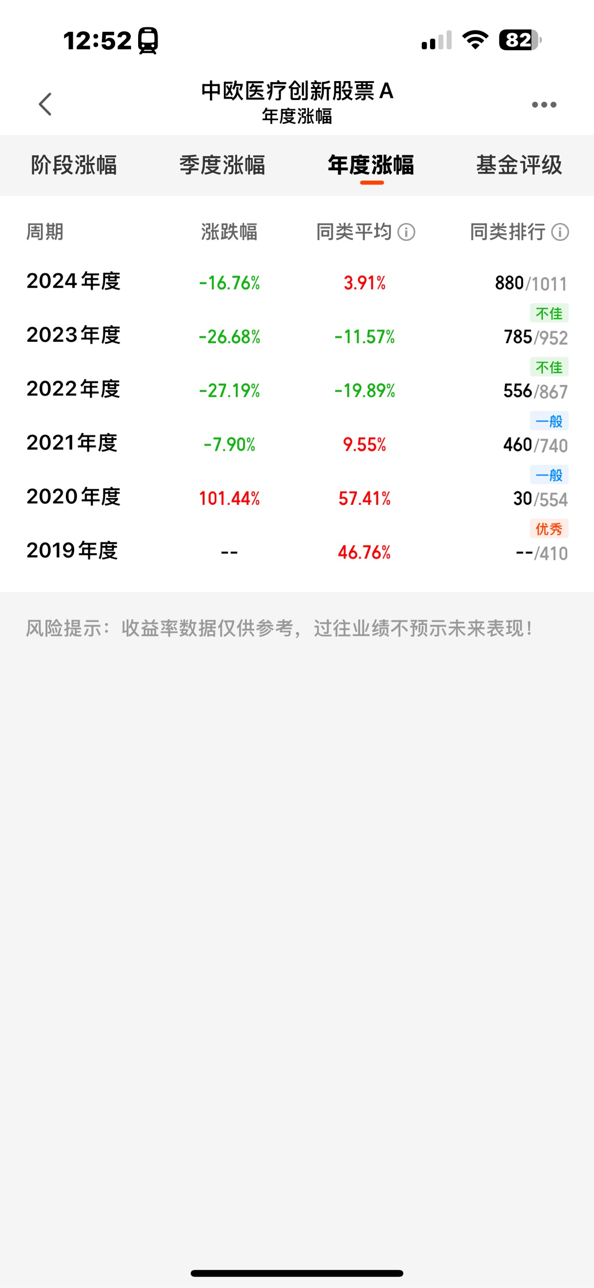 $中欧医疗创新股票A[006228]$ 一只雪吭的基,持有五年还亏二十个点,年年收益都比平均低,钱多没地方花的朋友可以来试试