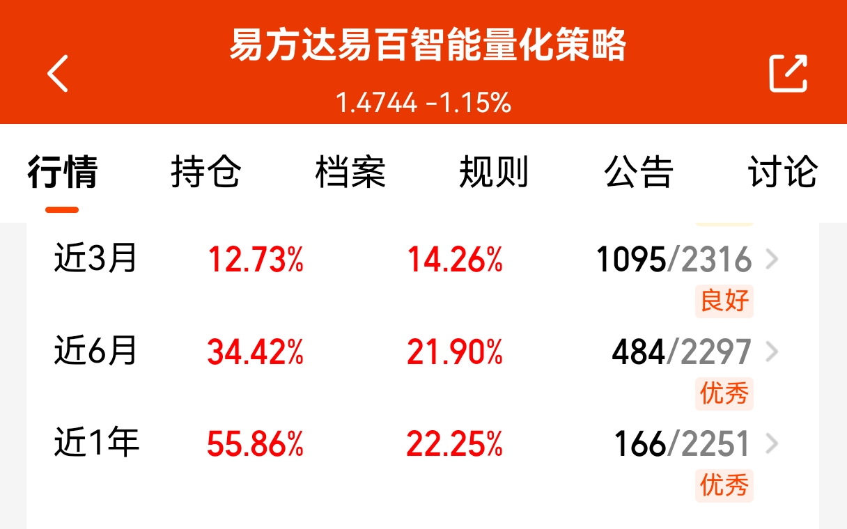 A股三大指数集体上涨,截至收盘,上证指数涨1.22%,深证成指涨1.73%,创业板指涨2.36%,北证50涨1.62%,行情又回来了,$易方达易百智能量化策略C(OTCFUND|005438)$今日也是上涨行情,涨幅超1%,近三个月涨幅12.73%,近六个月涨幅34.42%,近一年涨幅55.86%,业绩优秀,牛市买量化不怕轮动、防止踏空。