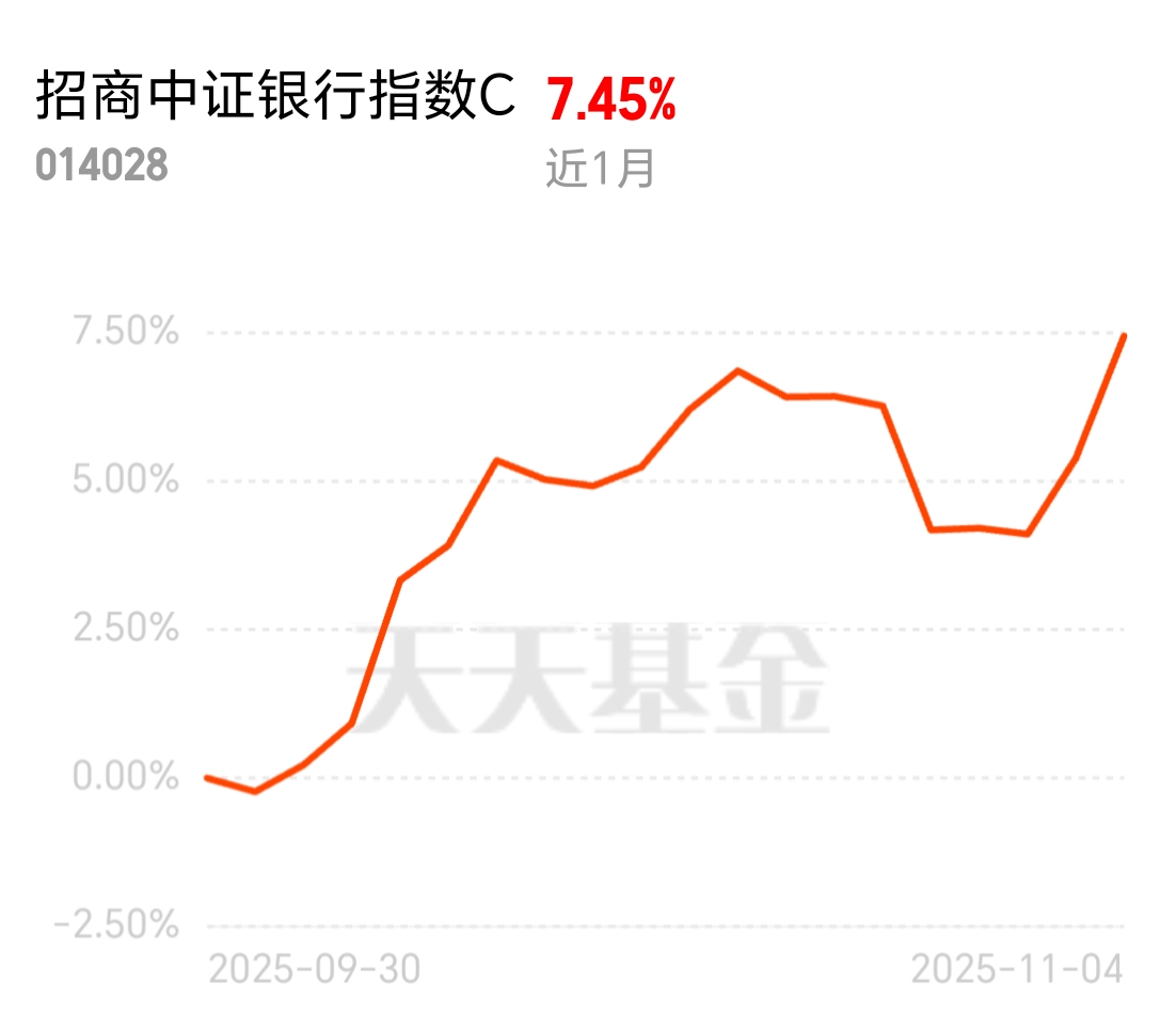 现在找高股息得看核心逻辑,港股无风险收益率4~5%,境内还不到2%,A股银行更划算。招商中证银行指数C表现不错,近1个月收益7.45%,是个不错的选择。