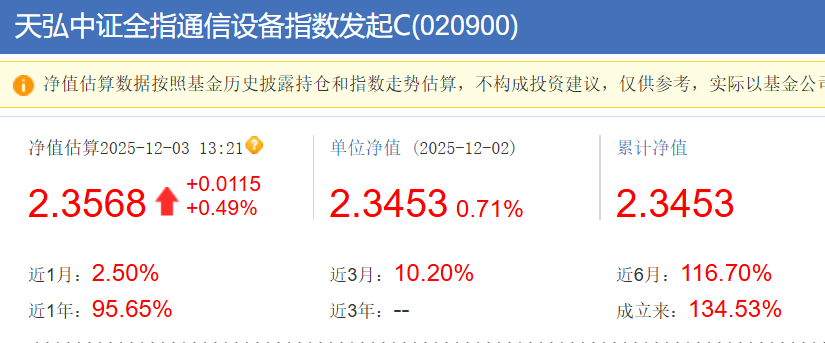 $天弘中证全指通信设备指数发起C$ 继续逆市7连涨!做差价的机会今天有,短期来看,光模块CPO板块的波动主要由市场情绪波动、资金止盈等因素引发,但行业基本面并未发生实质性变化。长期来看,AI算力需求的持续增长、技术迭代的加速、政策支持的强化,均支撑光模块CPO板块的高景气度,目前走势很好,不过我也不贪,今天加鸡腿,回调我还是会继续跟。